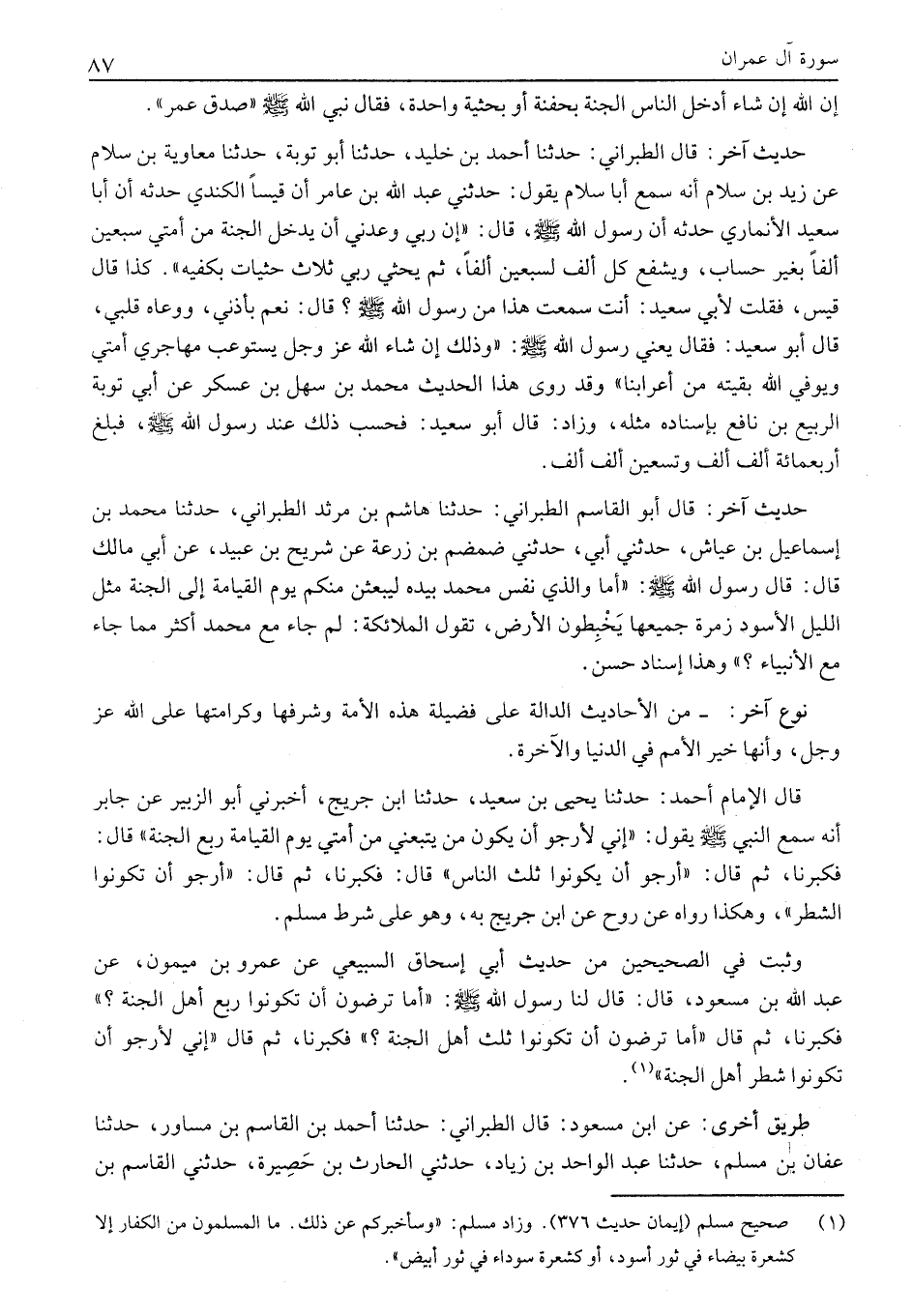 وَثَبَتَ فِي الصَّحِيحَيْنِ مِنْ حَدِيثِ أَبِي إِسْحَاقَ السَّبِيعِيِّ عَنْ عَمْرِو بْنِ مَيْمُونٍ، عَنْ عَبْدِ اللَّهِ بْنِ مَسْعُودٍ، قَالَ: قَالَ لَنَا رَسُولُ اللَّهِ صَلَّى اللَّهُ عَلَيْهِ وَسَلَّمَ: «أَمَا تَرْضَوْنَ أَنْ تَكُونُوا رُبُعَ أَهْلِ الْجَنَّةِ؟» فَكَبَّرْنَا، ثُمَّ قَالَ «أَمَا تَرْضَوْنَ أَنْ تَكُونُوا ثُلُثَ أَهْلِ الْجَنَّةِ؟» فَكَبَّرْنَا، ثُمَّ قَالَ «إِنِّي لَأَرْجُو أَنْ تَكُونُوا شَطْرَ أَهْلِ الْجَنَّةِ» «1» .