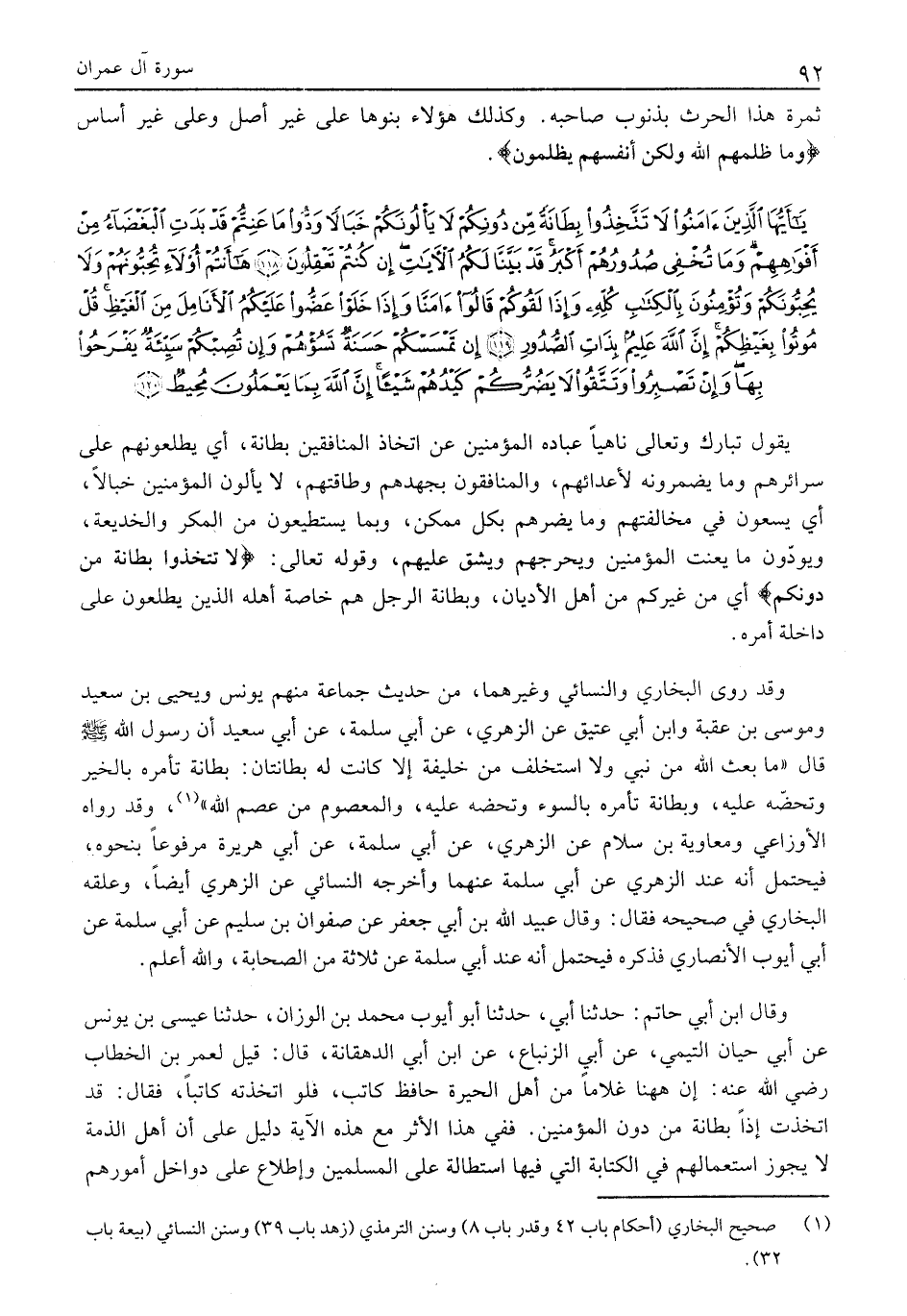 يَا أَيُّهَا الَّذِينَ آمَنُوا لَا تَتَّخِذُوا بِطانَةً مِنْ دُونِكُمْ لَا يَأْلُونَكُمْ خَبالاً وَدُّوا مَا عَنِتُّمْ قَدْ بَدَتِ الْبَغْضاءُ مِنْ أَفْواهِهِمْ وَما تُخْفِي صُدُورُهُمْ أَكْبَرُ قَدْ بَيَّنَّا لَكُمُ الْآياتِ إِنْ كُنْتُمْ تَعْقِلُونَ (118) هَا أَنْتُمْ أُولاءِ تُحِبُّونَهُمْ وَلا يُحِبُّونَكُمْ وَتُؤْمِنُونَ بِالْكِتابِ كُلِّهِ وَإِذا لَقُوكُمْ قالُوا آمَنَّا وَإِذا خَلَوْا عَضُّوا عَلَيْكُمُ الْأَنامِلَ مِنَ الْغَيْظِ قُلْ مُوتُوا بِغَيْظِكُمْ إِنَّ اللَّهَ عَلِيمٌ بِذاتِ الصُّدُورِ (119) إِنْ تَمْسَسْكُمْ حَسَنَةٌ تَسُؤْهُمْ وَإِنْ تُصِبْكُمْ سَيِّئَةٌ يَفْرَحُوا بِها وَإِنْ تَصْبِرُوا وَتَتَّقُوا لَا يَضُرُّكُمْ كَيْدُهُمْ شَيْئاً إِنَّ اللَّهَ بِما يَعْمَلُونَ مُحِيطٌ (120)