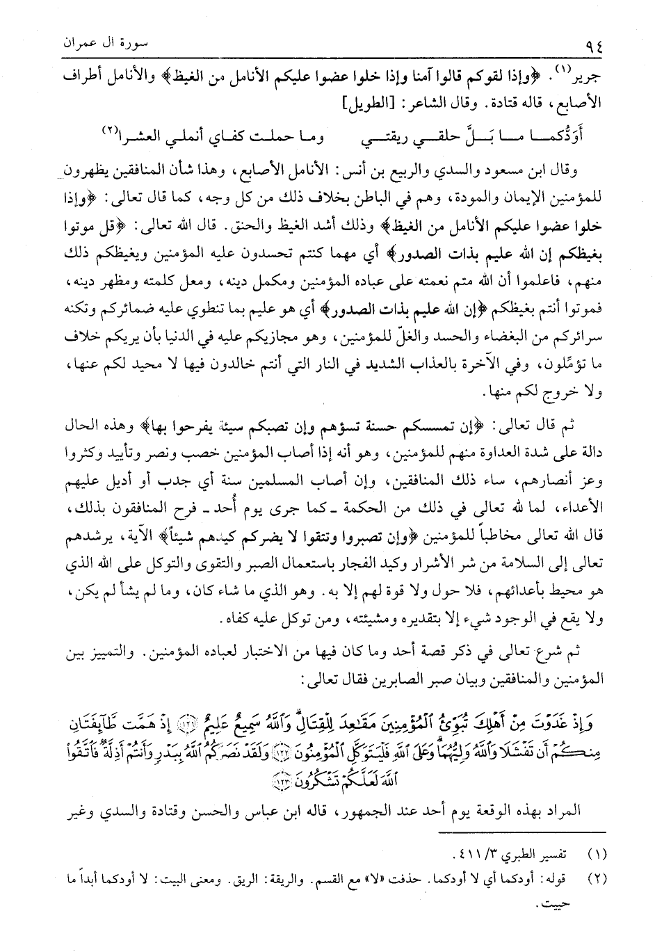جَرِيرٍ «1» . وَإِذا لَقُوكُمْ قالُوا آمَنَّا وَإِذا خَلَوْا عَضُّوا عَلَيْكُمُ الْأَنامِلَ مِنَ الْغَيْظِ وَالْأَنَامِلُ أَطْرَافُ الأصابع، قاله قتادة. وقال الشاعر: [الطويل]