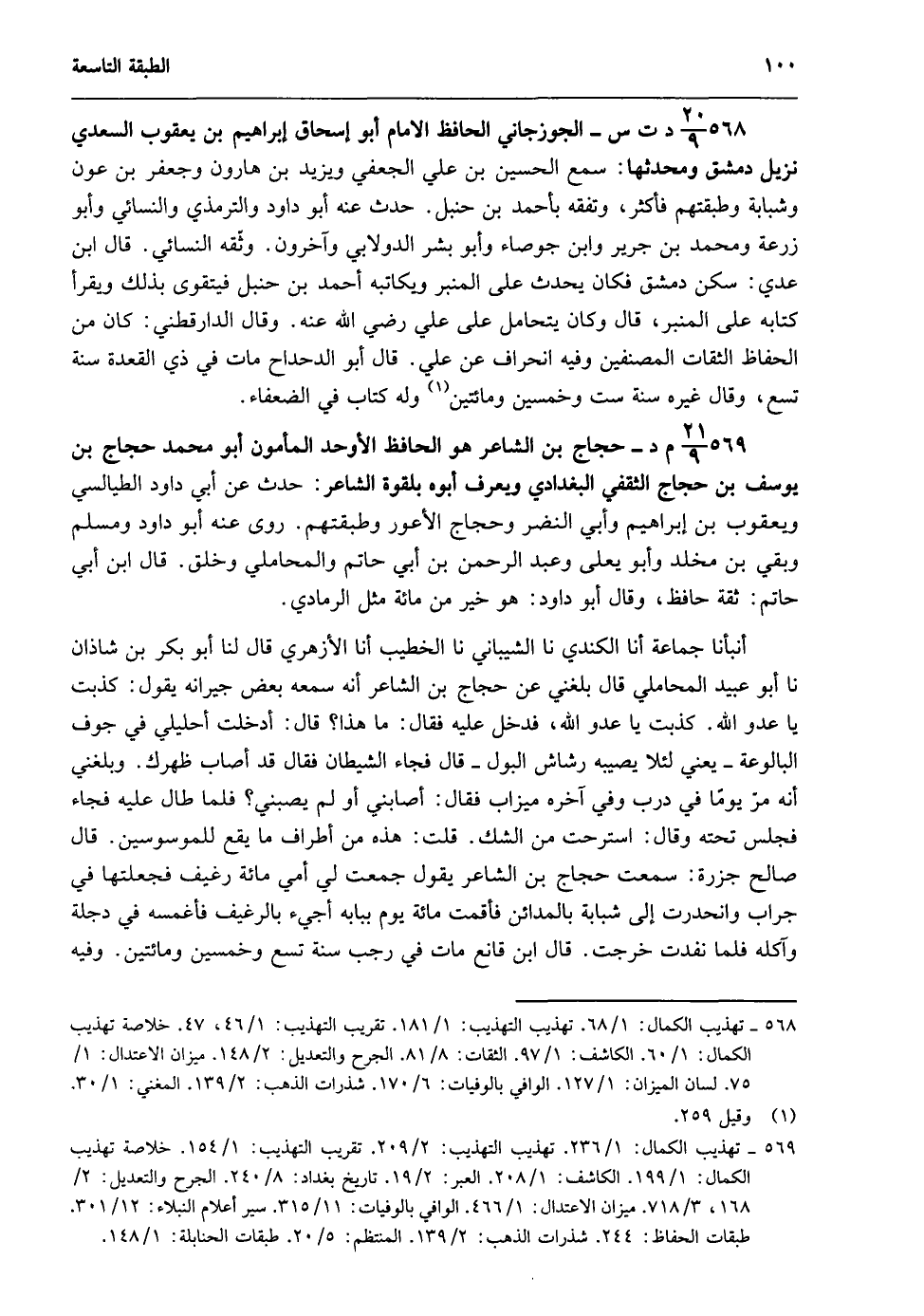 568- 20/ 9 د ت س - الجوزجاني الحافظ الإمام أبو إسحاق إبراهيم بن يعقوب السعدي نزيل دمشق ومحدثها: