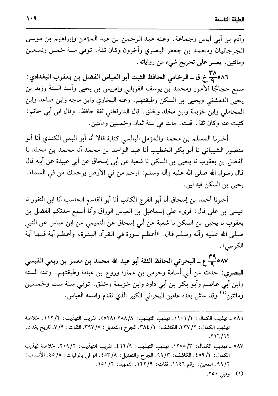 586- تهذيب الكمال: 2/ 1101. تهذيب التهذيب: 8/ 288 "528". تقريب التهذيب: 2/ 112. خلاصة تهذيب الكمال: 2/ 337. الكاشف: 2/ 384. الجرح والتعديل: 7/ 397. الثقات: 9/ 7. تاريخ بغداد: 12/ 266.