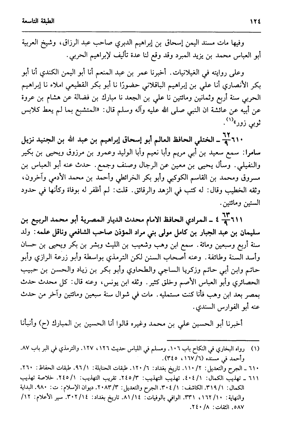 611- تهذيب الكمال: 1/ 404. تهذيب التهذيب: 3/ 245. تقريب التهذيب: 1/ 245. خلاصة تهذيب الكمال: 1/ 319. الكاشف: 1/ 304. الجرح والتعديل: 3/ 2083. ديوان الإسلام: ت: 980. البداية والنهاية: 10/ 162، 331. الوافي بالوفيات: 14/ 81. تاريخ بغداد: 14/ 302. سير الأعلام: 12/ 587. الثقات: 8/ 240.