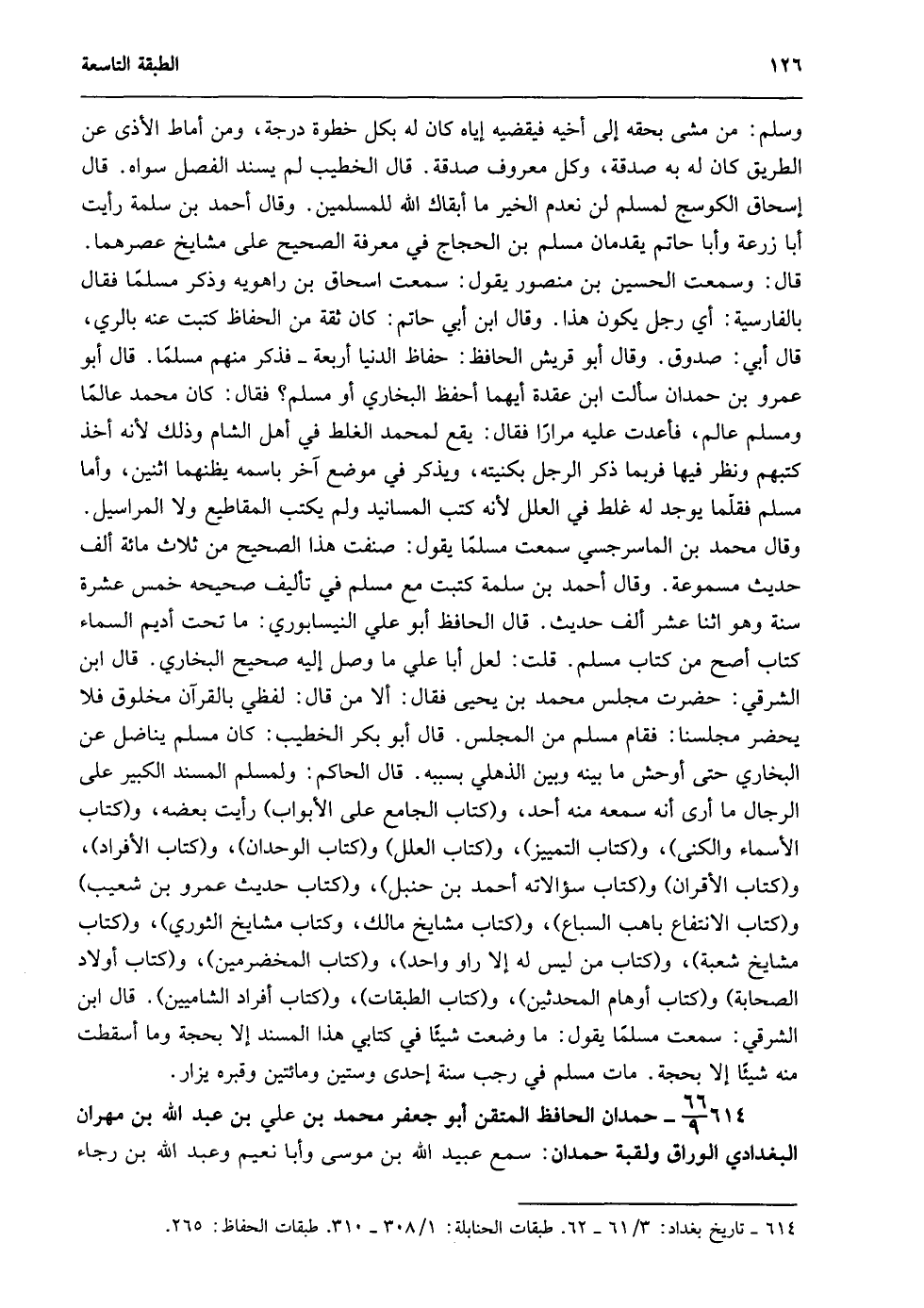 614- 66/9- حمدان الحافظ المتقن أبو جعفر محمد بن علي بن عبد الله بن مهران البغدادي الوراق ولقبه حمدان: