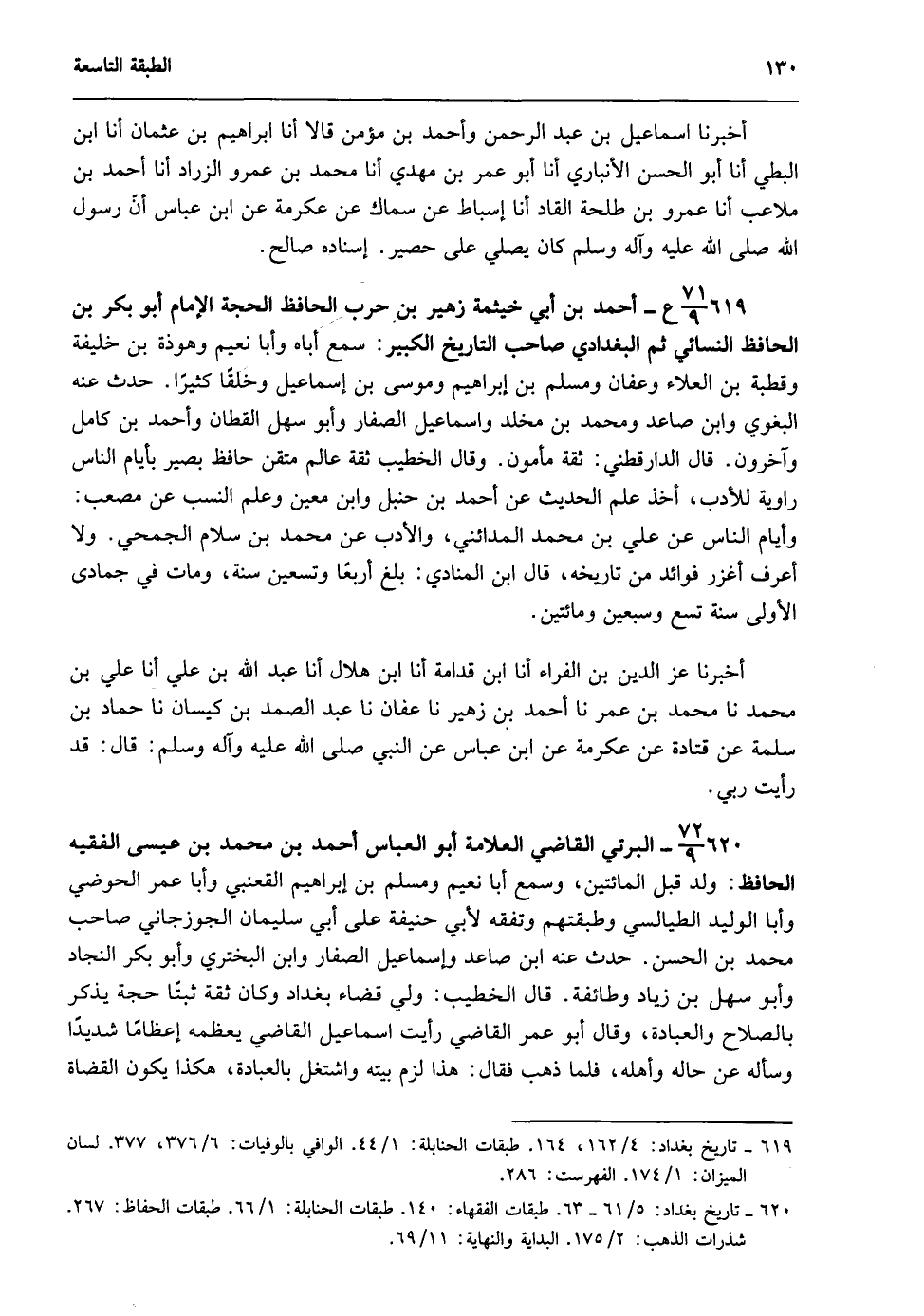 619- 71/ 9 ع- أحمد بن أبي خيثمة زهير بن حرب الحافظ الحجة الإمام أبو بكر بن الحافظ النسائي ثم البغدادي صاحب التاريخ الكبير: