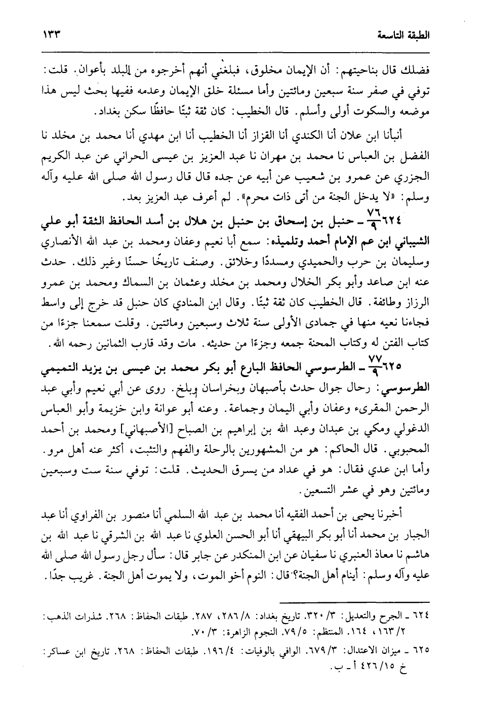 624- الجرح والتعديل: 3/ 320. تاريخ بغداد: 8/ 286، 287. طبقات الحفاظ: 268. شذرات الذهب: 2/ 163، 164. المنتظم: 5/ 79. النجوم الزاهرة: 3/ 70.