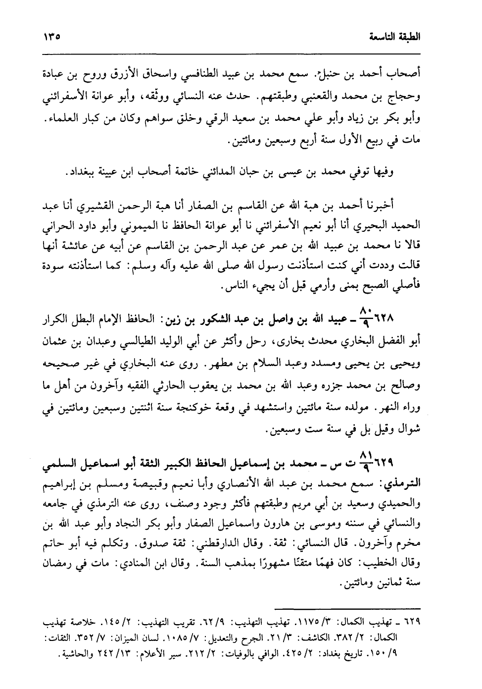 629- تهذيب الكمال: 3/ 1175. تهذيب التهذيب: 9/ 62. تقريب التهذيب: 2/ 145. خلاصة تهذيب الكمال: 2/ 382. الكاشف: 3/ 21. الجرح والتعديل: 7/ 1085. لسان الميزان: 7/ 352. الثقات: 9/ 150. تاريخ بغداد: 2/ 425. الوافي بالوفيات: 2/ 212. سير الأعلام: 13/ 242 والحاشية.
