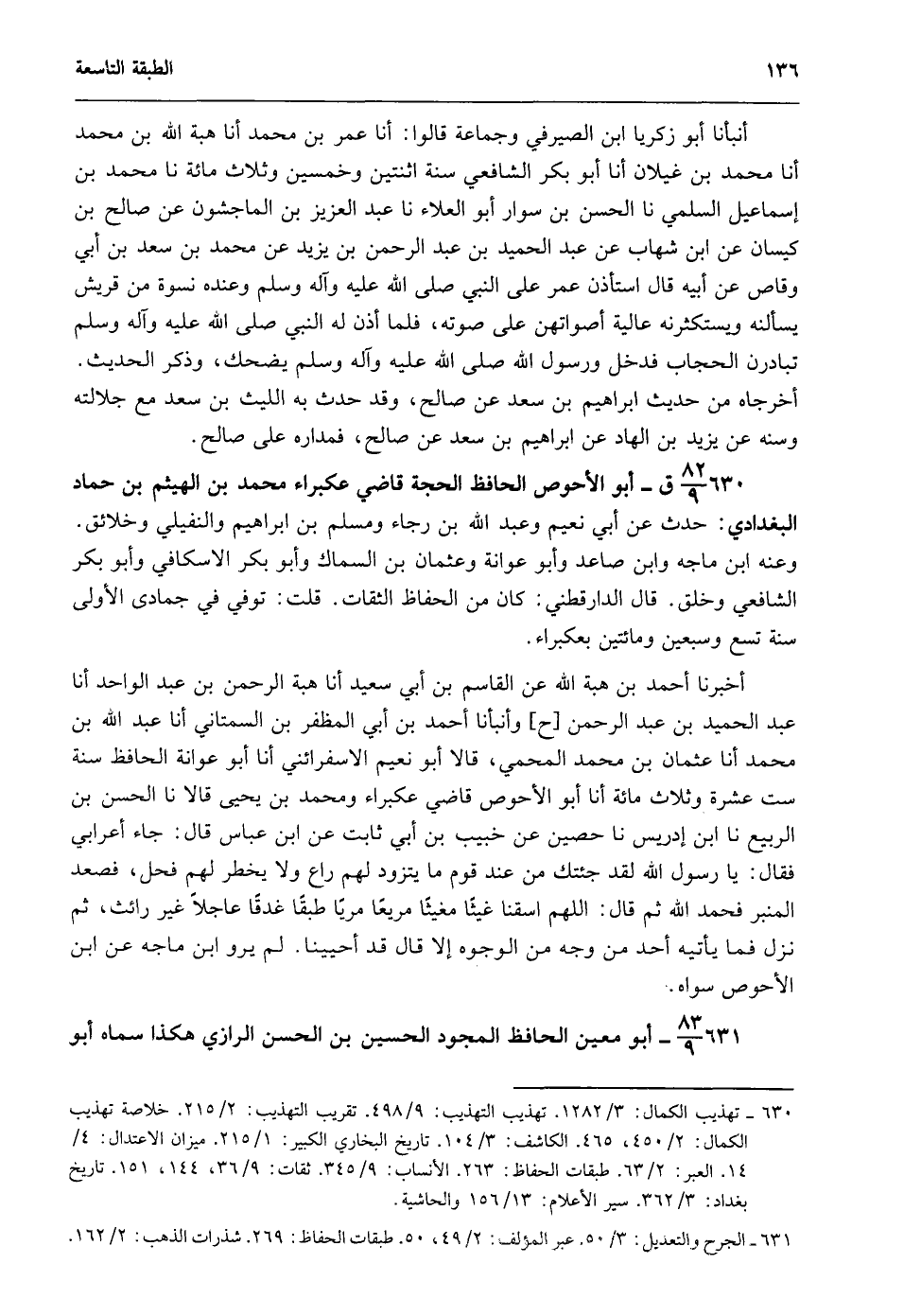 630- تهذيب الكمال: 3/ 1282. تهذيب التهذيب: 9/ 498. تقريب التهذيب: 2/ 215. خلاصة تهذيب الكمال: 2/ 450، 465. الكاشف: 3/ 104. تاريخ البخاري الكبير: 1/ 215. ميزان الاعتدال: 4/ 14. العبر: 2/ 63. طبقات الحفاظ: 263. الأنساب: 9/ 345. ثقات: 9/ 36، 144، 151. تاريخ بغداد: 3/ 362. سير الأعلام: 13/ 156 والحاشية.