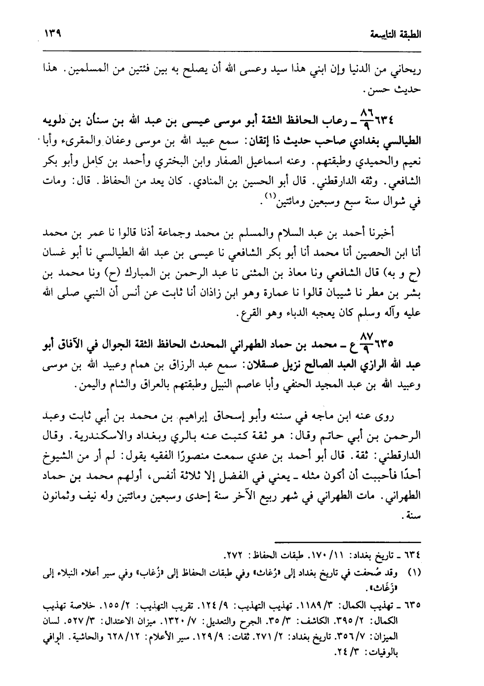 634- 86/ 9- رعاب الحافظ الثقة أبو موسى عيسى بن عبد الله بن سنان بن دلويه الطيالسي بغدادي صاحب حديث ذا إتقان: