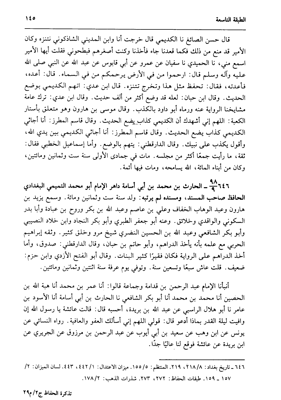 646- 98/ 9- الحارث بن محمد بن أبي أسامة داهر الإمام أبو محمد التميمي البغدادي الحافظ صاحب المسند ومسنده لم يرتبه: