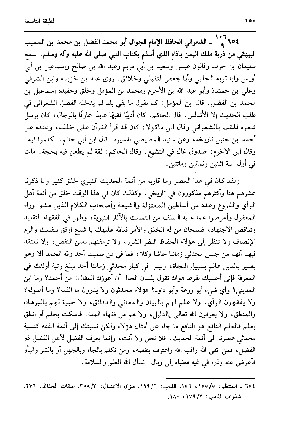654- 106/9 - الشعراني الحافظ الإمام الجوال أبو محمد الفضل بن محمد بن المسيب البيهقي من ذرية ملك اليمن باذام الذي أسلم بكتاب النبي صلى الله عليه وآله وسلم: