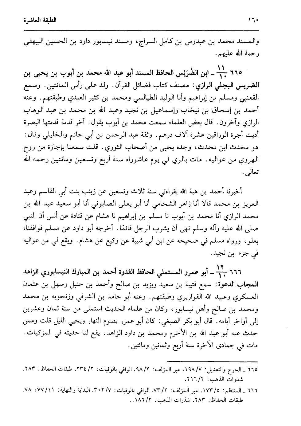 665- 11/ 10- ابن الضريس الحافظ المسند أبو عبد الله محمد بن أيوب بن يحيى بن الضريس البجلي الرازي: