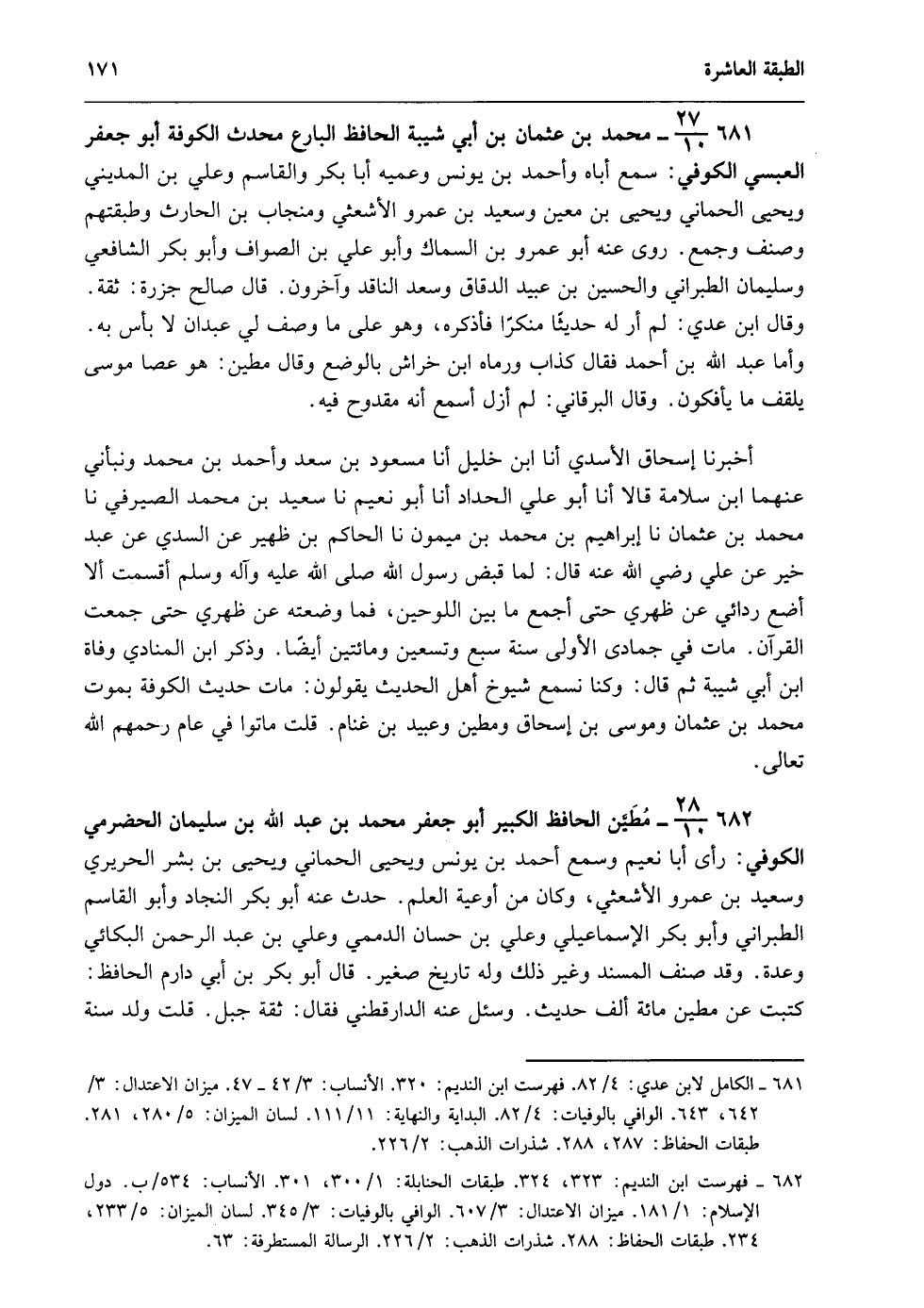 681- 27/ 10- محمد بن عثمان بن أبي شيبة الحافظ البارع محدث الكوفة أبو جعفر العبسي الكوفى: