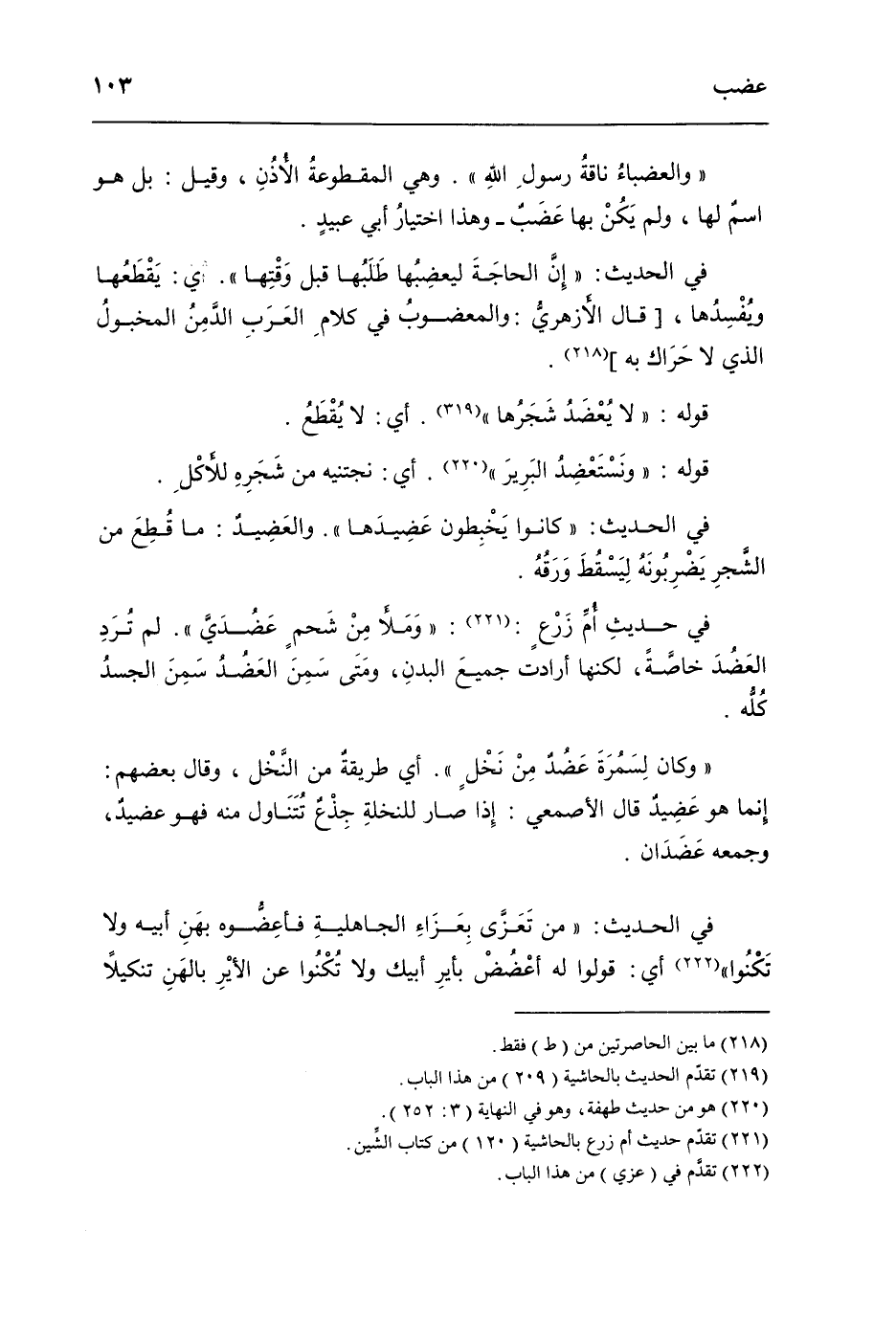 فِي الحَدِيث من تعزى بعزاء الْجَاهِلِيَّة فأعضوه بِهن أَبِيه وَلَا تكنوا أَي قُولُوا لَهُ أعضض بأير أَبِيك وَلَا تكنوا عَن الأير بالهن تنكيلا