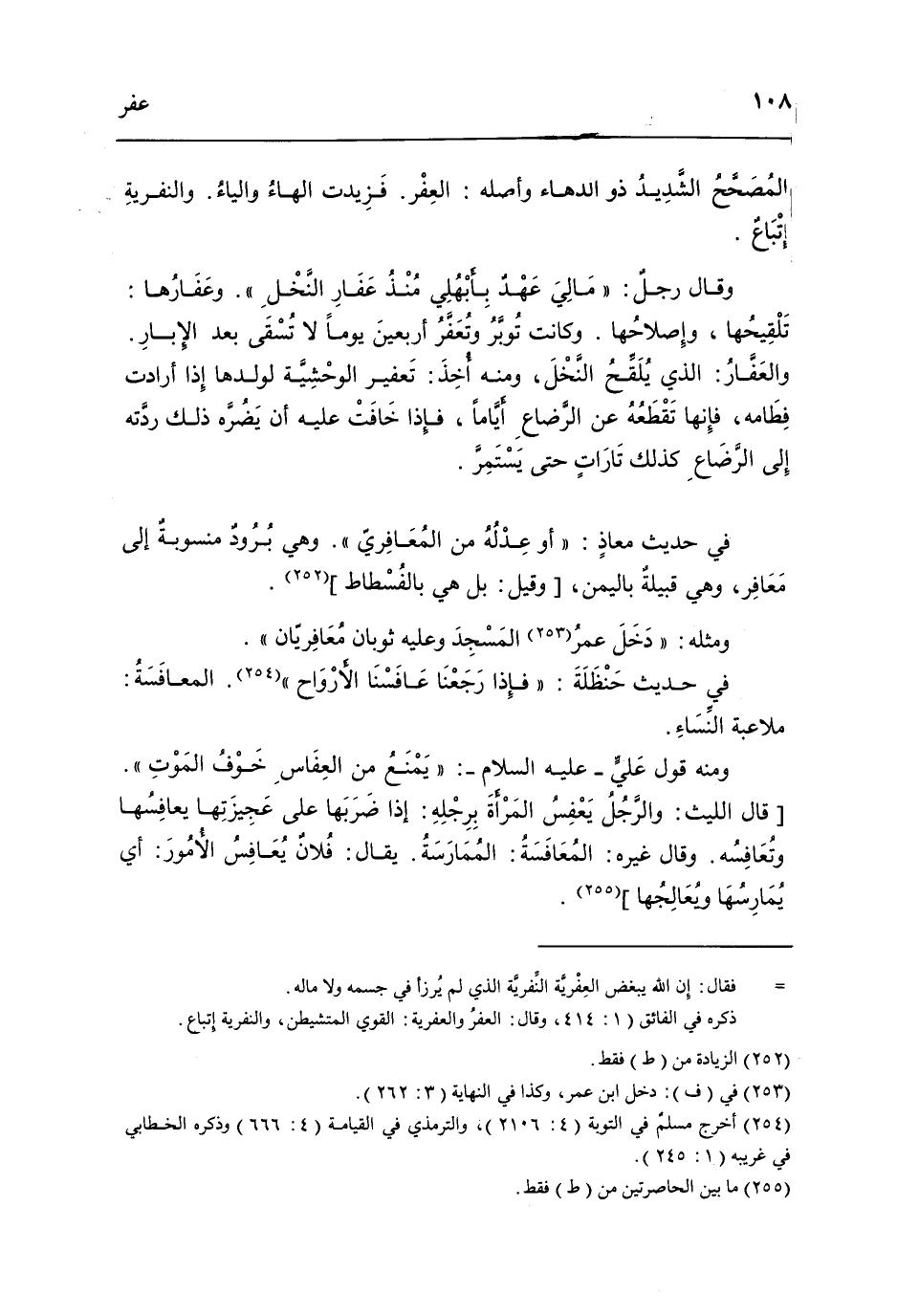 وَقَالَ رجل مَالِي عهد بأبهلي مُنْذُ عفار النّخل وعفارها تلقيحها وإصلاحها وَكَانَت توبر وتعفر أَرْبَعِينَ يَوْمًا لَا تسقى بعد الإبار والعفار الَّذِي يلقح النّخل وَمِنْه أَخذ تعفير الوحشية لولدها إِذا أَرَادَت فطامه فَإِنَّهَا تقطعه عَن الرَّضَاع أَيَّامًا فَإِذا خَافت عَلَيْهِ أَن يضرّهُ ذَلِك ردته إِلَى الرَّضَاع كَذَلِك تارات حَتَّى يسْتَمر