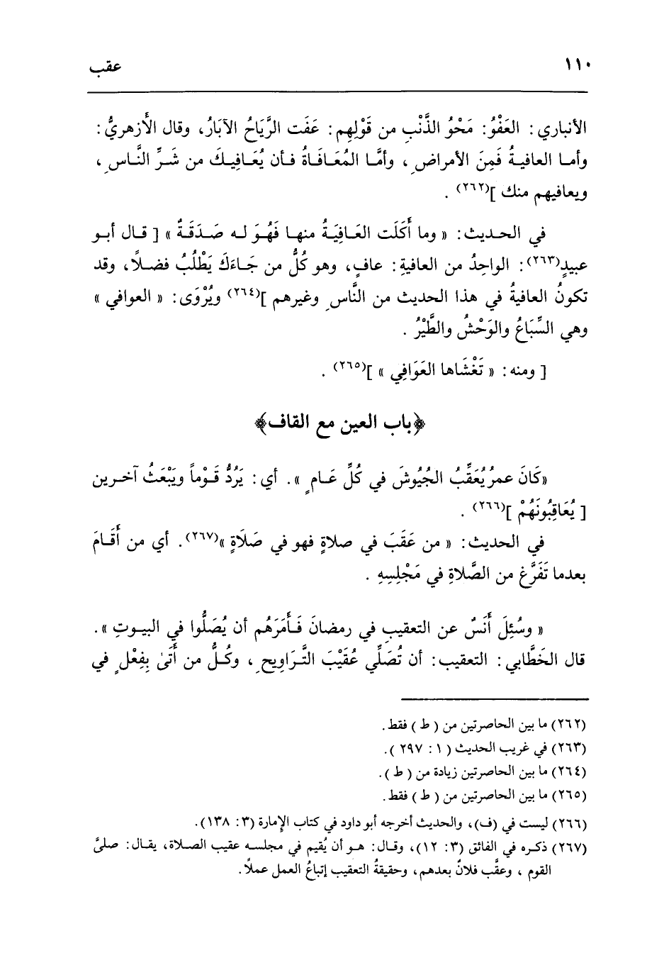 فِي الحَدِيث وَمَا أكلت الْعَافِيَة مِنْهَا فَهُوَ لَهُ صَدَقَة قَالَ أَبُو عبيد الْوَاحِد من الْعَافِيَة عاف وَهُوَ كل من جَاءَك يطْلب فضلا وَقد تكون الْعَافِيَة فِي هَذَا الحَدِيث من النَّاس وَغَيرهم وَيروَى العوافي وَهِي السبَاع والوحش وَالطير