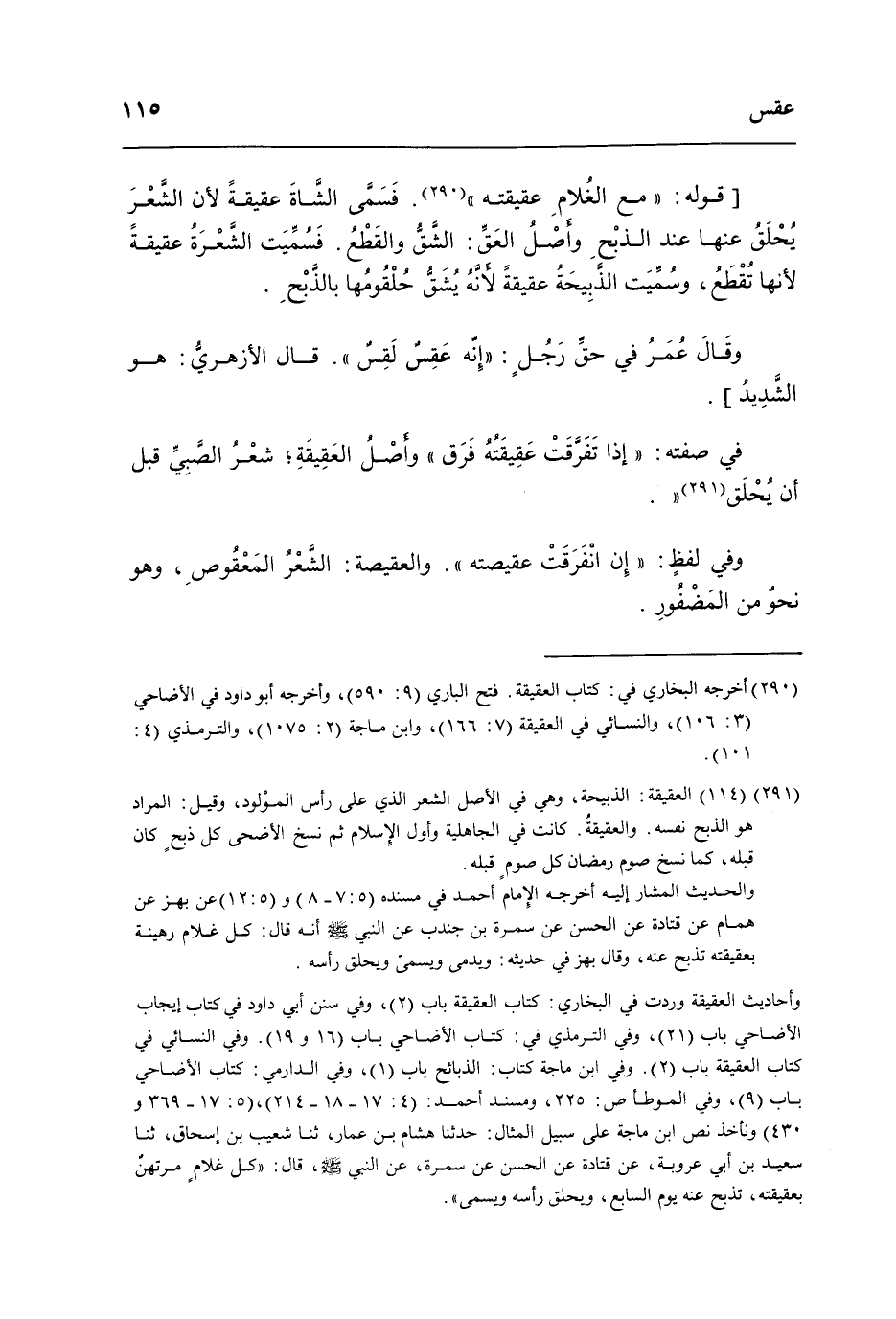 قَوْله مَعَ الْغُلَام عقيقته فَسَمَّى الشَّاة عقيقة لِأَن الشّعْر يحلق عَنْهَا عِنْد الذّبْح وأصل العق الشق وَالْقطع فسميت الشعرة عقيقة لِأَنَّهَا تقطع وَسميت الذَّبِيحَة عقيقة لِأَنَّهُ يشق حلقومها بِالذبْحِ