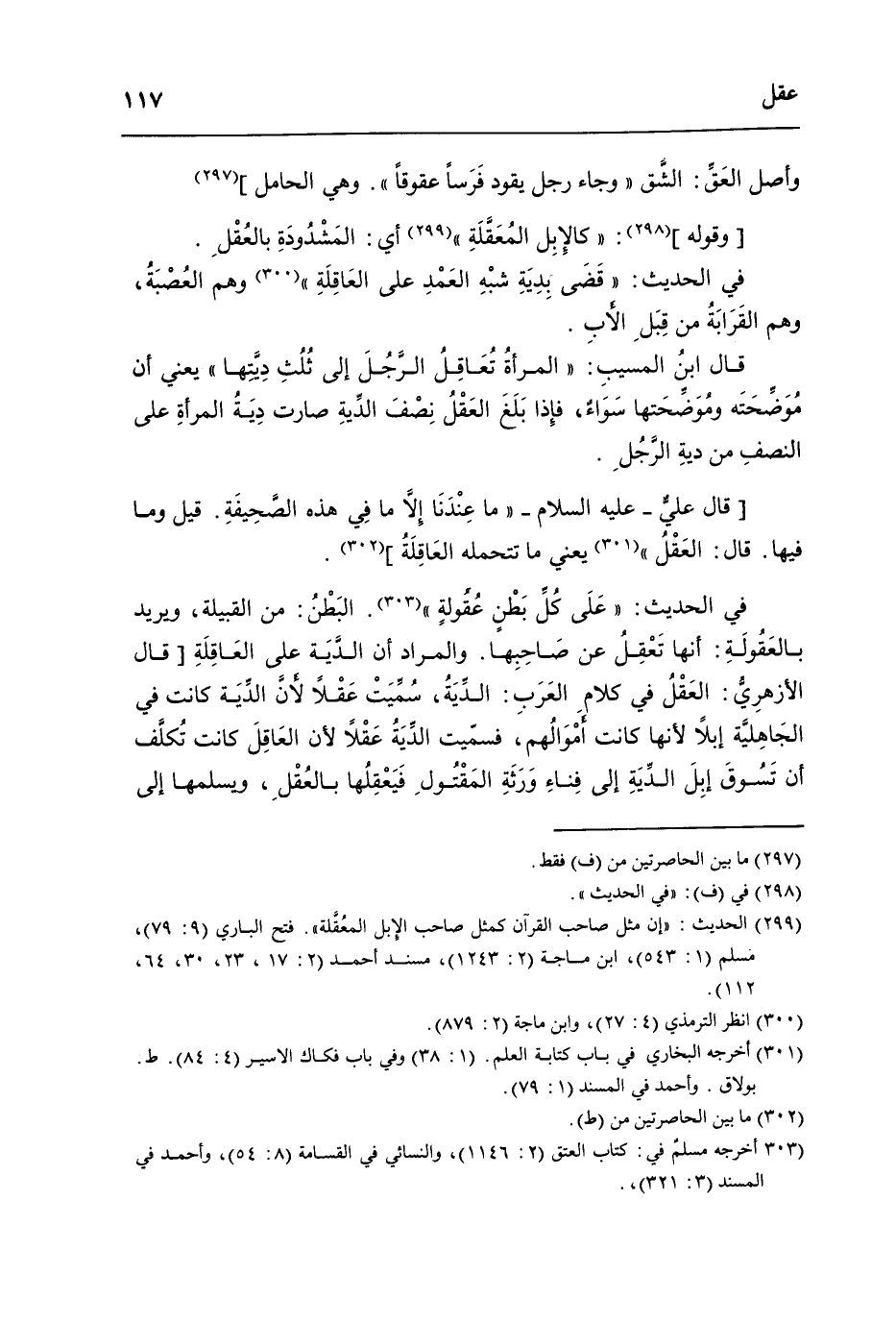 (قَالَ عَلّي عَلَيْهِ السَّلَام مَا عندنَا إِلَّا مَا فِي هَذِه الصَّحِيفَة قيل وَمَا فِيهَا قَالَ الْعقل يَعْنِي مَا تتحمله الْعَاقِلَة
