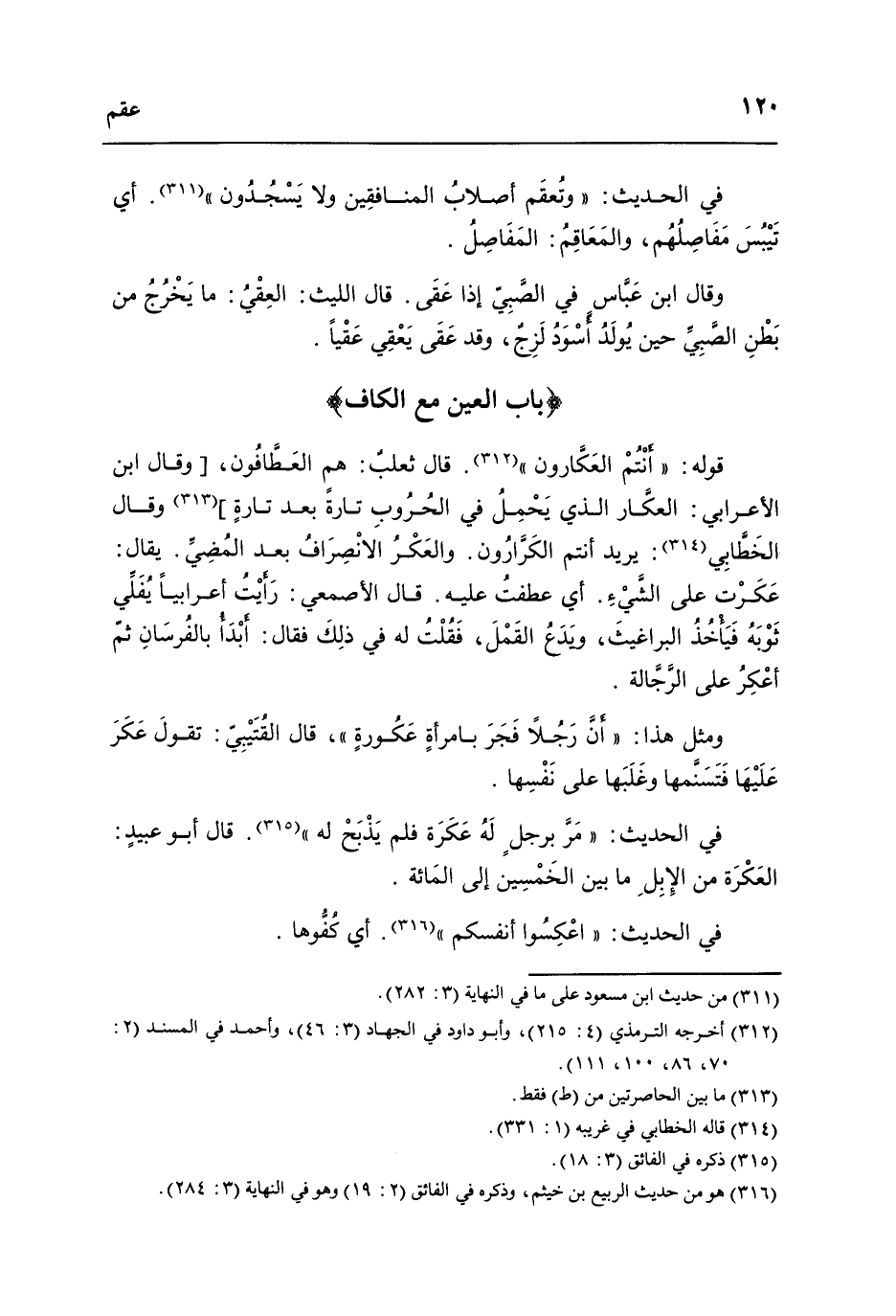 فِي الحَدِيث وتعقم أصلاب الْمُنَافِقين وَلَا يَسْجُدُونَ أَي تيبس مفاصلهم والمعاقم المفاصل