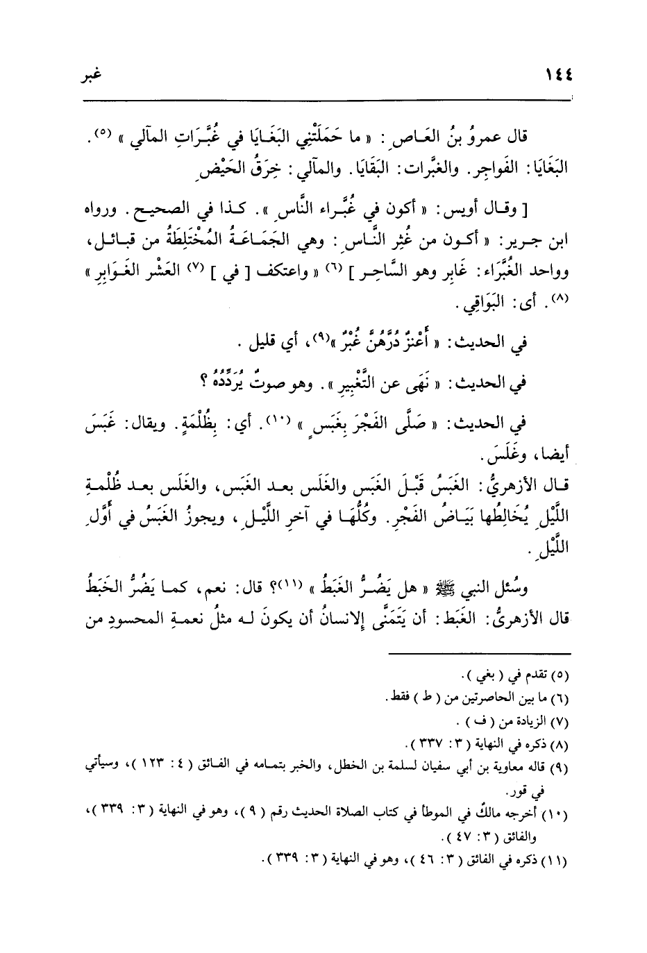 وَقَالَ أويس أكون فِي غبراء النَّاس كَذَا فِي الصَّحِيح وَرَوَاهُ ابْن جرير أكون من غثر النَّاس وَهِي الْجَمَاعَة المختلطة من قبائل وَوَاحِد الغبراء غابر وَهُوَ السَّاحر وَاعْتَكف فِي الْعشْر الغوابر أَي الْبَوَاقِي