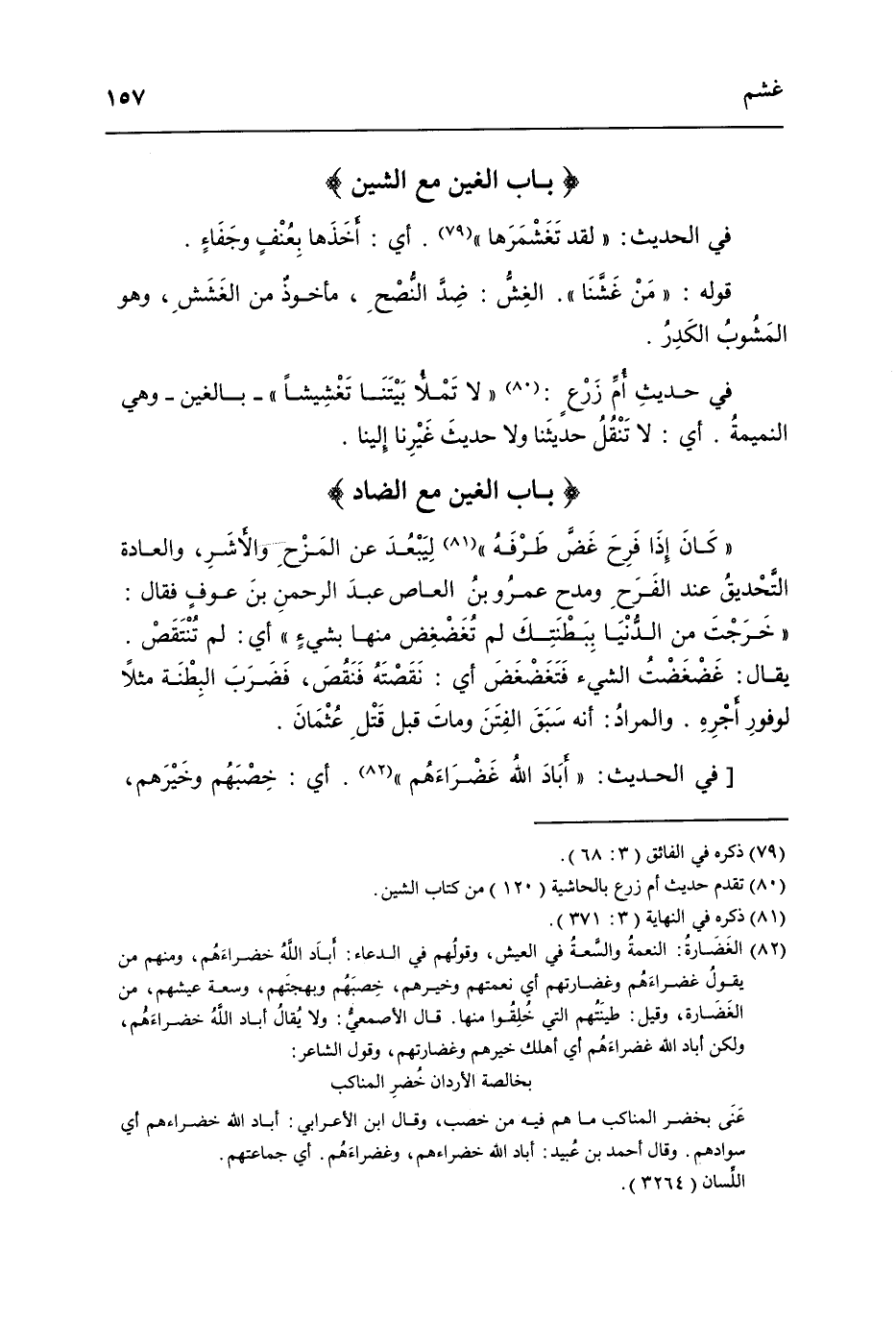 كَانَ إِذا فَرح غض طرفه ليبعد عَن المزح والأشر وَالْعَادَة التحديق عِنْد الْفَرح ومدح عَمْرو بن الْعَاصِ عبد الرَّحْمَن بن عَوْف فَقَالَ خرجت من الدُّنْيَا ببطنتك لم تغضغض مِنْهَا بِشَيْء أَي لم تنْتَقض يُقَال غضغضت الشَّيْء فتغضغض أَي نقصته فنقص فَضرب البطنة مثلا لوفور أجره وَالْمرَاد أَنه سبق الْفِتَن وَمَات قبل قتل عُثْمَان