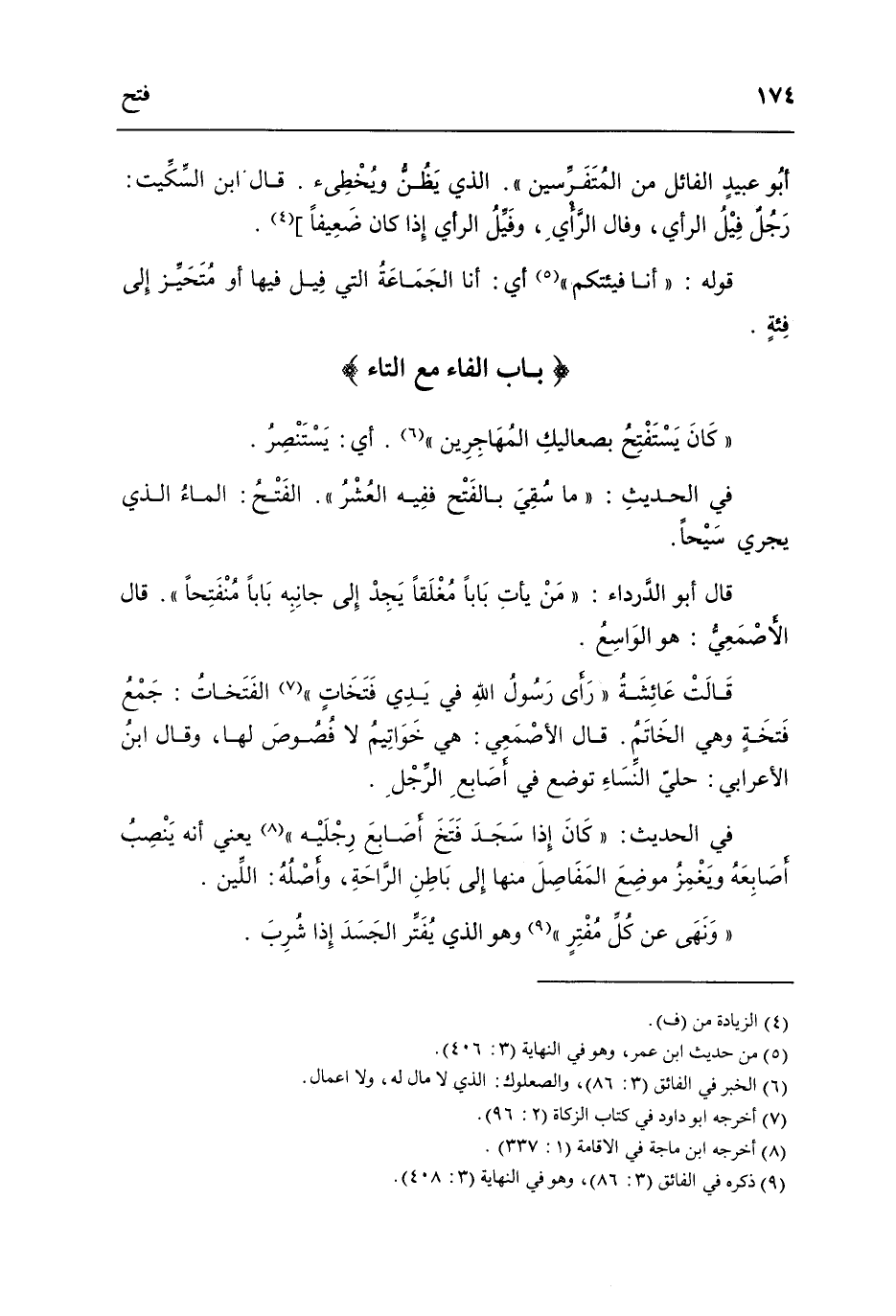 قَالَت عَائِشَة رَأَى رَسُول الله فِي يَدي فتخات الفتخات جمع فتخة وَهِي الْخَاتم قَالَ الْأَصْمَعِي هِيَ خَوَاتِيم لَا فصوص لَهَا وَقَالَ ابْن الْأَعرَابِي حلي النِّسَاء تُوضَع فِي أَصَابِع الرجل