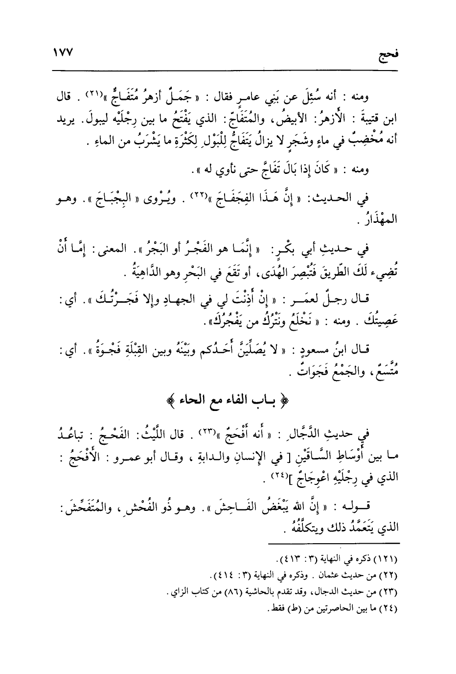 فِي حَدِيث الدَّجَّال أَنه أفحج قَالَ اللَّيْث الفحج تبَاعد مَا بَين أوساط السَّاقَيْن فِي الْإِنْسَان وَالدَّابَّة وَقَالَ أَبُو عَمْرو الأفحج الَّذِي فِي رجلَيْهِ اعوجاج