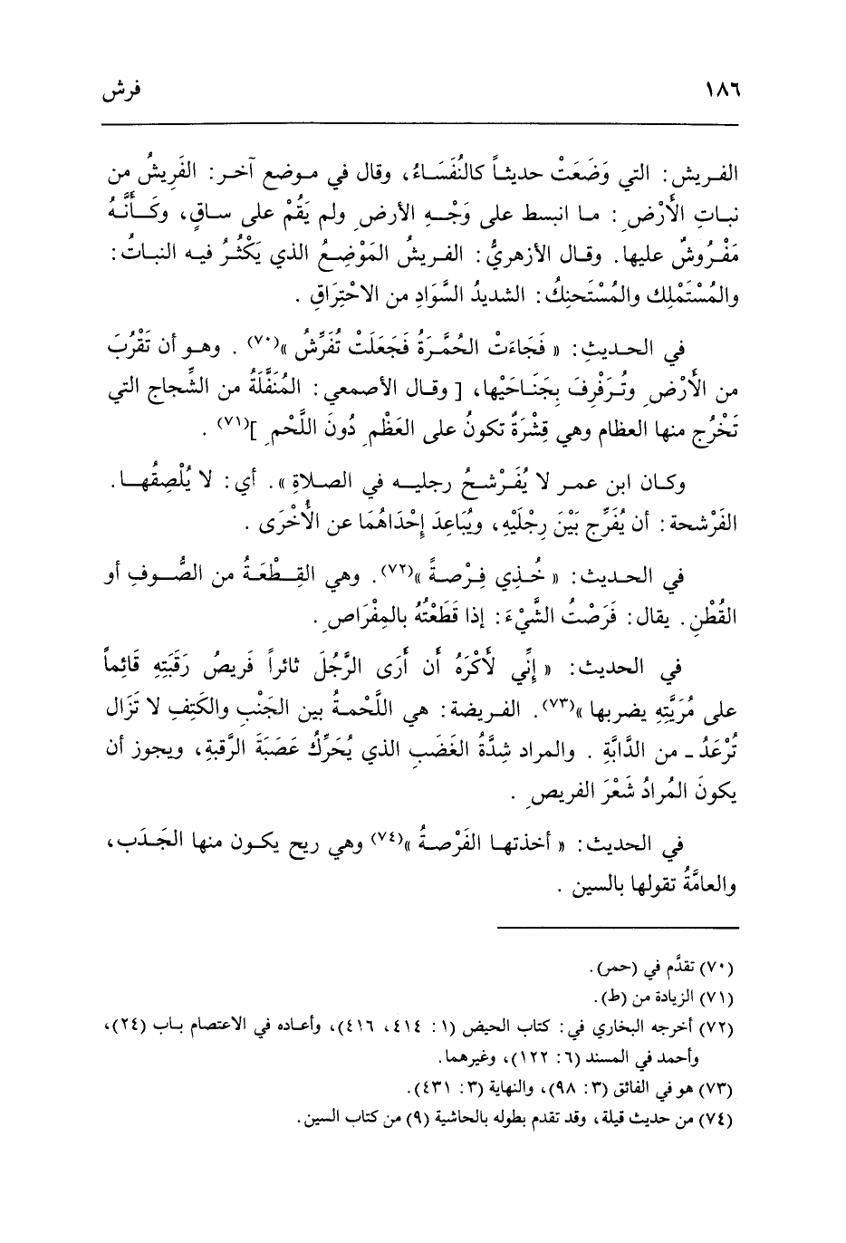 الفريش الَّتِي وضعت حَدِيثا كالنفساء وَقَالَ فِي مَوضِع آخر الفريش من نَبَات الأَرْض مَا انبسط عَلَى وَجه الأَرْض وَلم يقم عَلَى سَاق وَكَأَنَّهُ مفروش عَلَيْهَا وَقَالَ الْأَزْهَرِي الفريش الْموضع الَّذِي يكثر فِيهِ النَّبَات والمستملك والمستحنك الشَّديد السوَاد من الاحتراق