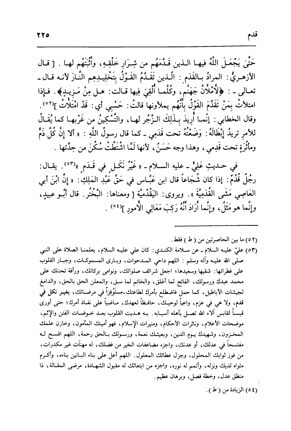 حَتَّى يَجْعَل الله فِيهَا الَّذين قدمهم من شرار خلقه وأثبتهم لَهَا قَالَ الْأَزْهَرِي المُرَاد بالقدم الَّذين تقدم القَوْل بتخليدهم النَّار لِأَنَّهُ قَالَ تَعَالَى {لأملأن جَهَنَّم} و {يَوْم نقُول لِجَهَنَّم هَل امْتَلَأت وَتقول هَل من مزِيد} فَإِذا امْتَلَأت بِمن تقدم القَوْل بِأَنَّهُم يملئونها قَالَت حسبي أَي قد امْتَلَأت