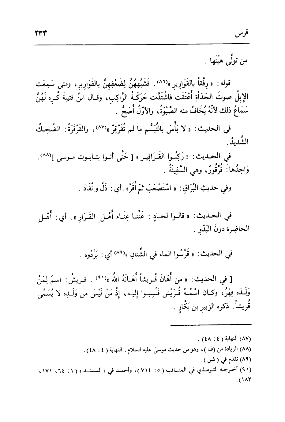 فِي الحَدِيث من أهان قُريْشًا أهانه الله قُرَيْش اسْم لمن وَلَده فهر وَكَانَ اسْمه قُرَيْش فنسبوا إِلَيْهِ إِذْ من لَيْسَ من وَلَده لَا يُسمى قُريْشًا ذكره الزبير بن بكار