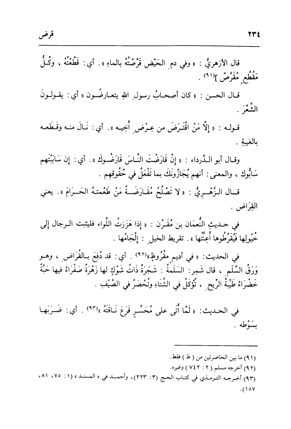 قَالَ الْأَزْهَرِي وَفِي دم الْحيض قرصته بِالْمَاءِ أَي قطعته وكل مقطع مقرص