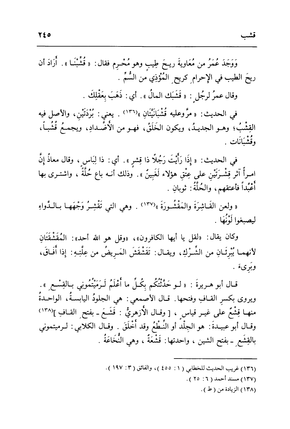 فِي الحَدِيث مر وَعَلِيهِ قشبانيتان يَعْنِي بردتين وَالْأَصْل فِيهِ القشب وَهُوَ الْجَدِيد وَيكون الْخلق فَهُوَ من الأضداد وَيجمع قشبا وقشبانات