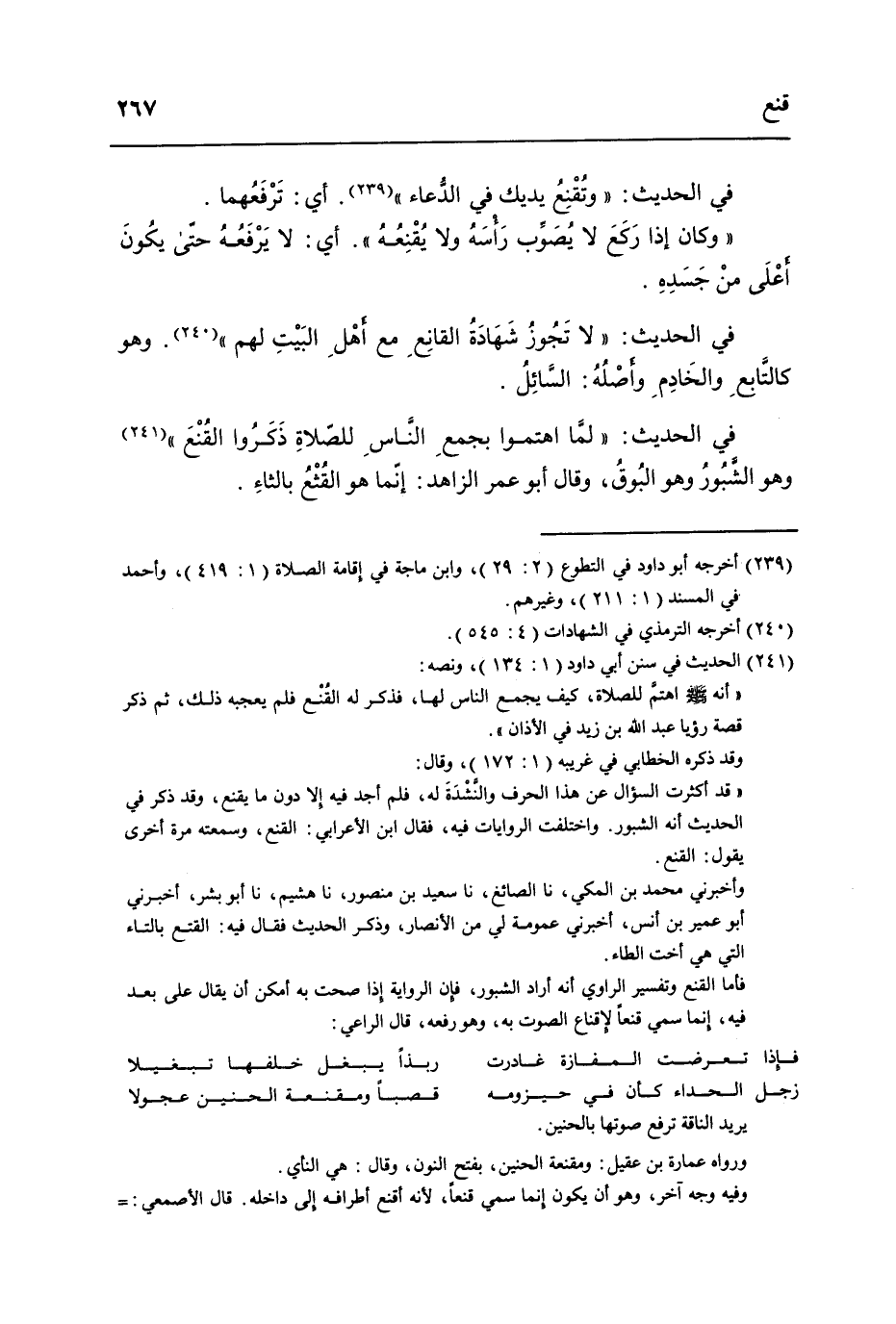 فِي الحَدِيث لما اهتموا بِجمع النَّاس للصَّلَاة ذكرُوا القنع وَهُوَ الشبور وَهُوَ البوق وَقَالَ أَبُو عمر الزَّاهِد إِنَّمَا هُوَ القثع بالثاء