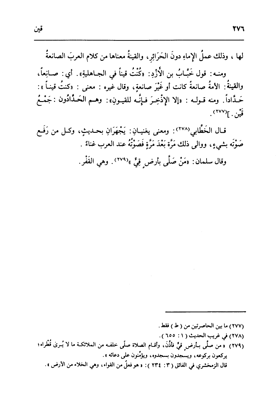 وَمِنْه قَول خباب بن الأزد كنت قينا فِي الْجَاهِلِيَّة أَي صانعا والقينة الْأمة صانعة كَانَت أَو غير صانعة وَقَالَ غَيره مَعْنَى كنت قينا حدادا وَمِنْه قَوْله إِلَّا الْإِذْخر فَإِنَّهُ للقيون وهم الحدادون جمع قين
