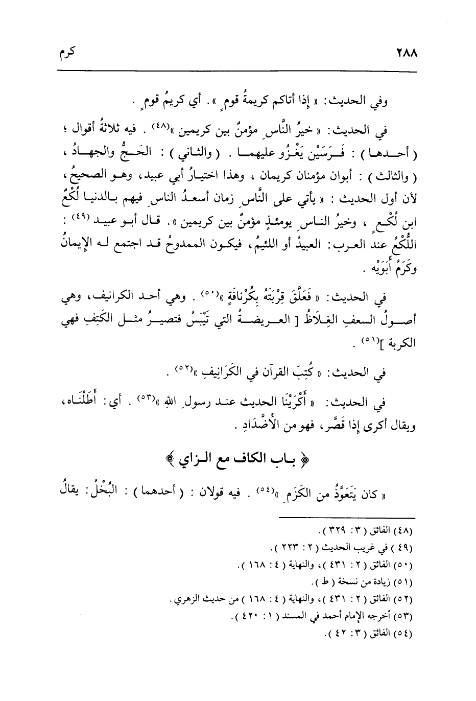 فِي الحَدِيث خير النَّاس مُؤمن بَين كريمين فِيهِ ثلَاثه أَقْوَال أَحدهَا فرسين يَغْزُو عَلَيْهِمَا وَالثَّانِي الْحَج وَالْجهَاد وَالثَّالِث أَبَوَانِ مُؤْمِنَانِ كريمان وَهَذَا اخْتِيَار أبي عبيد وَهُوَ الصَّحِيح لِأَن أول الحَدِيث يَأْتِي عَلَى النَّاس زمَان أسعد النَّاس فيهم بالدنيا لكع ابْن لكع وَخير النَّاس يَوْمئِذٍ مُؤمن بَين كريمين قَالَ أَبُو عبيد اللكع عِنْد الْعَرَب العبيد أَو اللَّئِيم فَيكون الممدوح قد اجْتمع لَهُ الْإِيمَان وكرم أَبَوَيْهِ