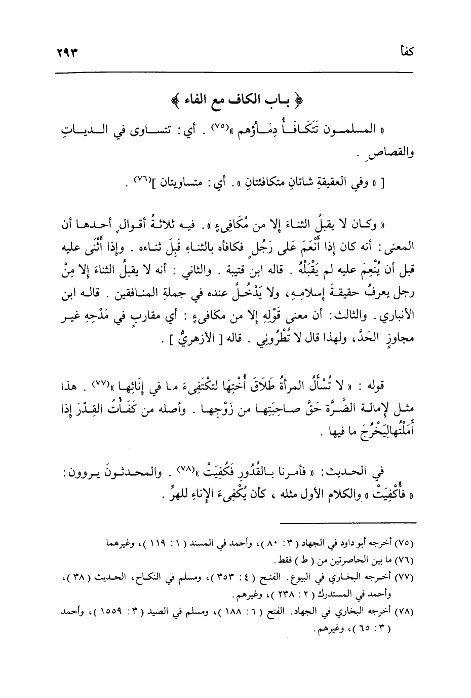 الْمُسلمُونَ تَتَكَافَأ دِمَاؤُهُمْ أَي تتساوى فِي الدِّيات وَالْقصاص