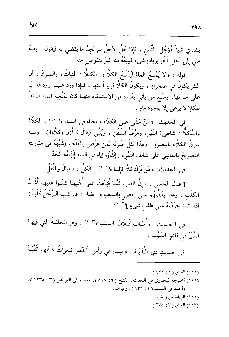 قَوْله لَا يمْنَع المَاء ليمنع الْكلأ الْكلأ النَّبَات وَالْمرَاد أَن الْبِئْر يكون فِي صحراء وَيكون الْكلأ قَرِيبا مِنْهَا فَإِذا ورد عَلَيْهَا وَارِد فغلب عَلَى مَا بهَا وَمنع من يَأْتِي بعده من الاسْتِسْقَاء مِنْهَا كَانَ بِمَنْعه المَاء مَانِعا للكلأ لَا يرْعَى إِلَّا بِوُجُود مَاء