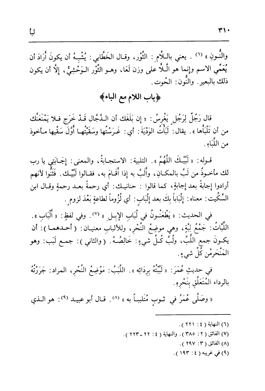 فِي الحَدِيث يطعنون فِي لباب الْإِبِل وَفِي لفظ ألباب اللبات جمع لبة وَهِي مَوضِع النَّحْر وللألباب مَعْنيانِ أَحدهمَا أَن يكون جمع اللب ولب كل شَيْء خالصه وَالثَّانِي جمع لبب وَهُوَ المنحر من كل شَيْء