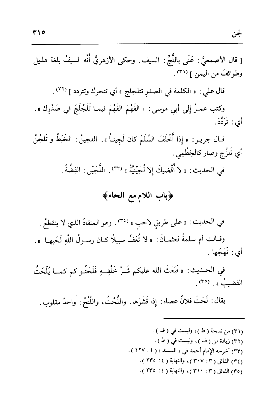 قَالَ الْأَصْمَعِي عَنى باللج السَّيْف وَحَكَى الْأَزْهَرِي أَنه السَّيْف بلغَة هُذَيْل وَطَوَائِف من الْيمن