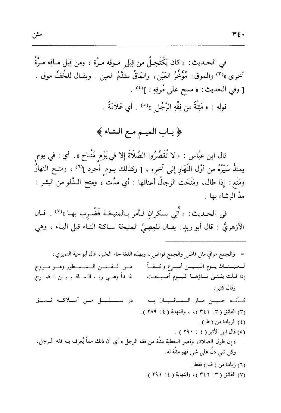 قَالَ ابْن عَبَّاس لَا تقصرُوا الصَّلَاة إِلَّا فِي يَوْم متاح أَي فِي يَوْم يَمْتَد سيره من أول النَّهَار إِلَى آخِره وَكَذَلِكَ يَوْم أجرد ومتح النَّهَار ومتع إِذا طَال ومتحت الرِّجَال أعناقها أَي مدت ومتح الدَّلْو من الْبِئْر مد الرشاء بهَا