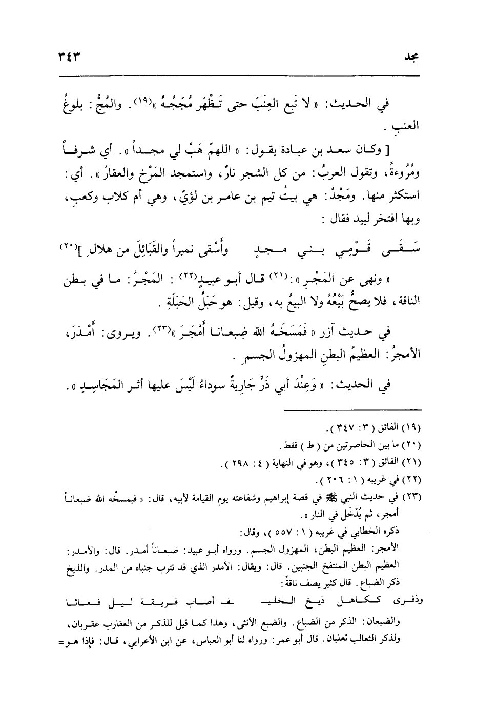 وَكَانَ سعد بن عبَادَة يَقُول اللَّهُمَّ هَب لي مجدا أَي شرفا ومروءة وَتقول الْعَرَب من كل الشّجر نَار واستمجد المرخ وَالْعَقار أَي استكثر مِنْهَا ومجد هِيَ بَيت تيم بن عَامر بن لؤَي وَهِي أم كلاب وَكَعب وَبهَا افتخر لبيد فَقَالَ