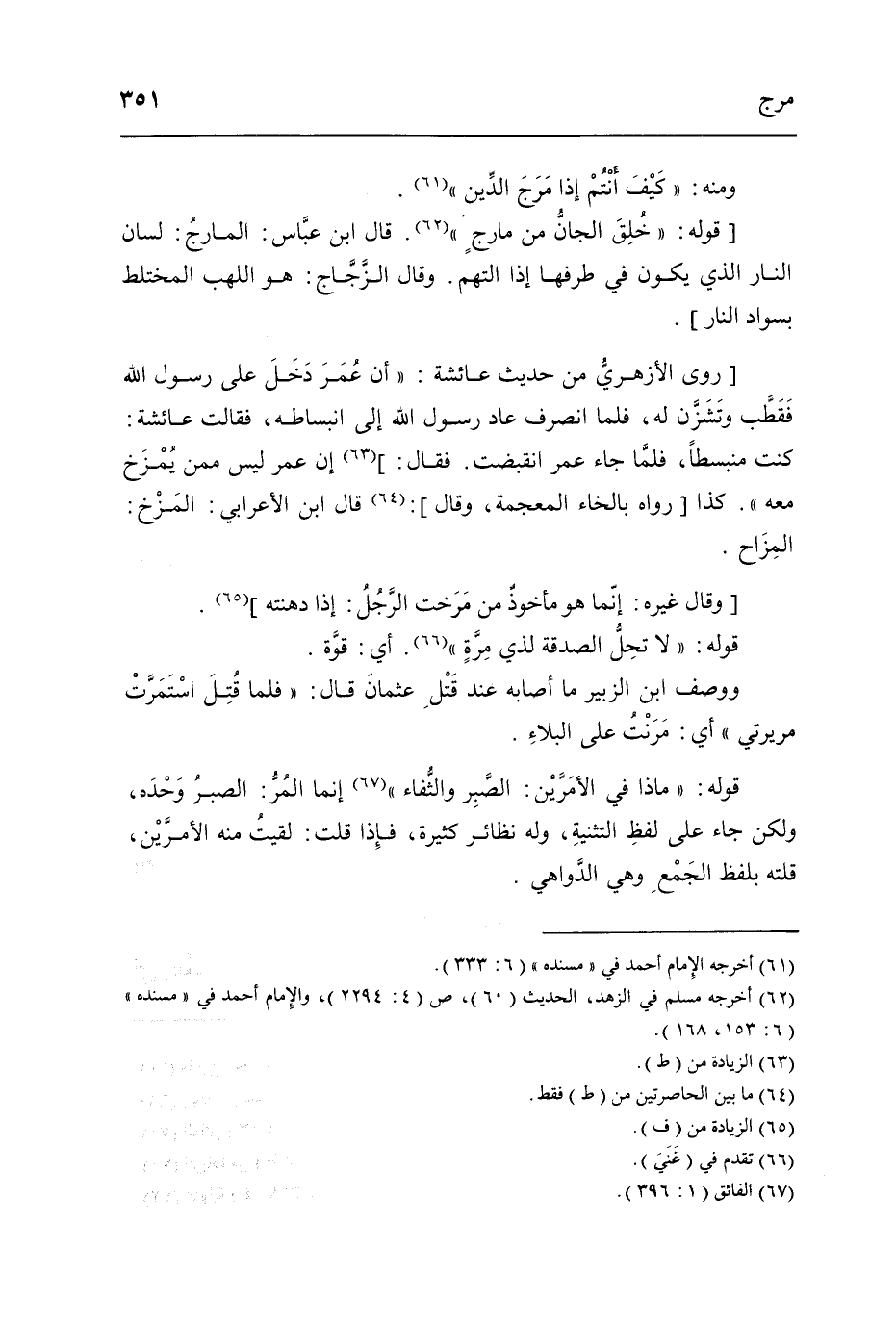 قَوْله {وَخلق الجان من مارج} قَالَ ابْن عَبَّاس المارج لِسَان النَّار الَّذِي يكون فِي طرفها إِذا التهم وَقَالَ الزّجاج هُوَ اللهب الْمُخْتَلط بسواد النَّار