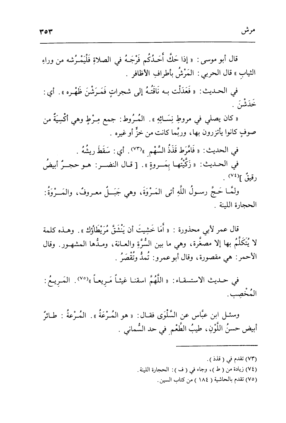 فِي الحَدِيث فعدلت بِهِ نَاقَته إِلَى شجرات فمرشن ظَهره أَي خدشن