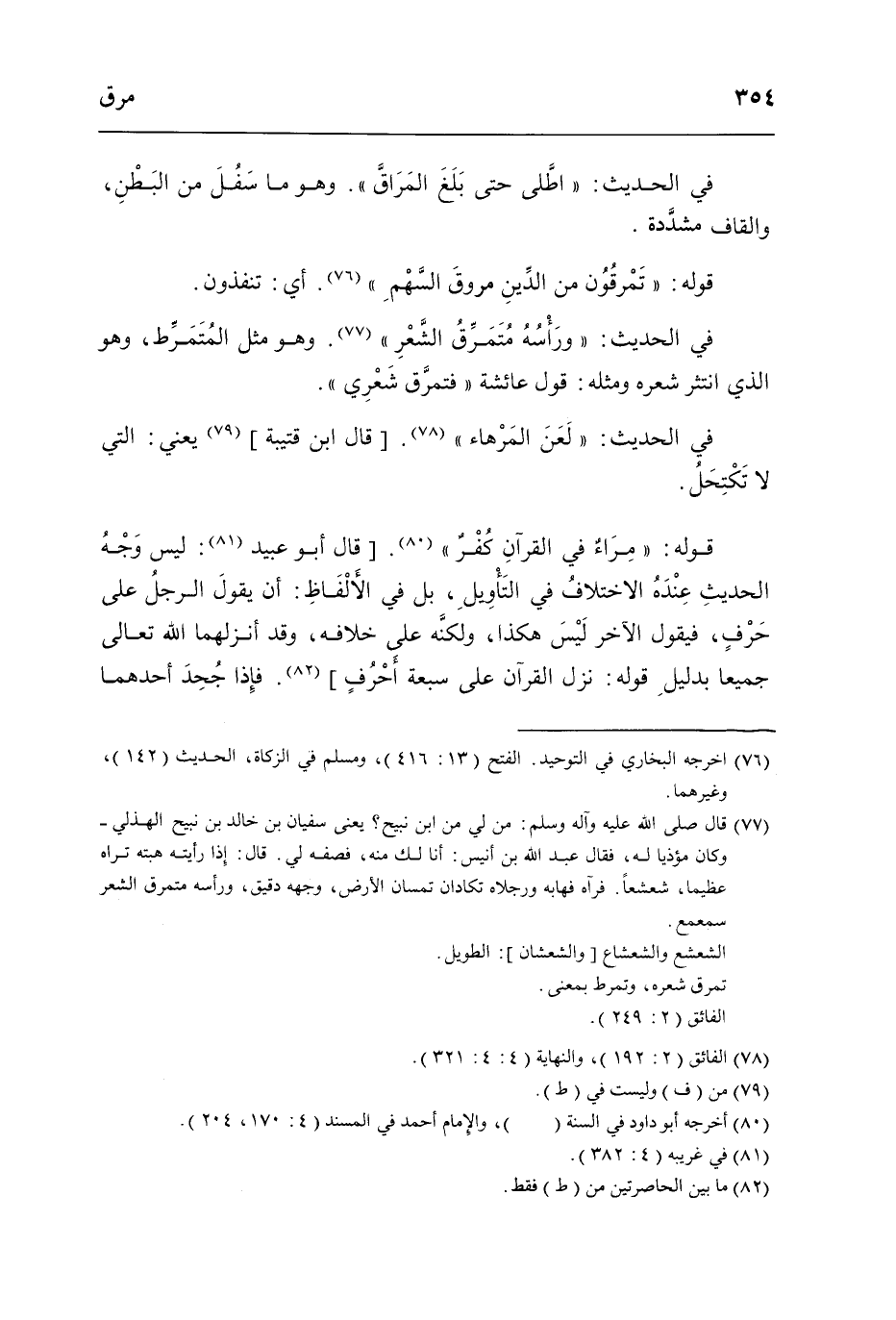 قَوْله مراء فِي الْقُرْآن كفر قَالَ أَبُو عبيد لَيْسَ وَجه الحَدِيث عِنْده الِاخْتِلَاف فِي التَّأْوِيل بل فِي الْأَلْفَاظ أَن يَقُول الرجل عَلَى حرف فَيَقُول الآخر لَيْسَ هَكَذَا وَلكنه عَلَى خِلَافه وَقد أنزلهما الله تَعَالَى جَمِيعًا بِدَلِيل قَوْله (نزل الْقُرْآن عَلَى سَبْعَة أحرف) فَإِذا جحد أَحدهمَا