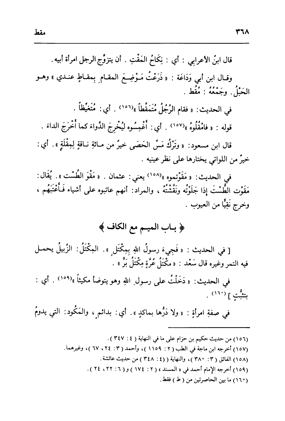 فِي الحَدِيث مقوتموه يَعْنِي عُثْمَان مقو الطست يُقَال مقوت الطست إِذا جلوته ونقشته وَالْمرَاد أَنهم عاتبوه عَلَى أَشْيَاء فأعتبهم وَخرج نقيا من الْعُيُوب