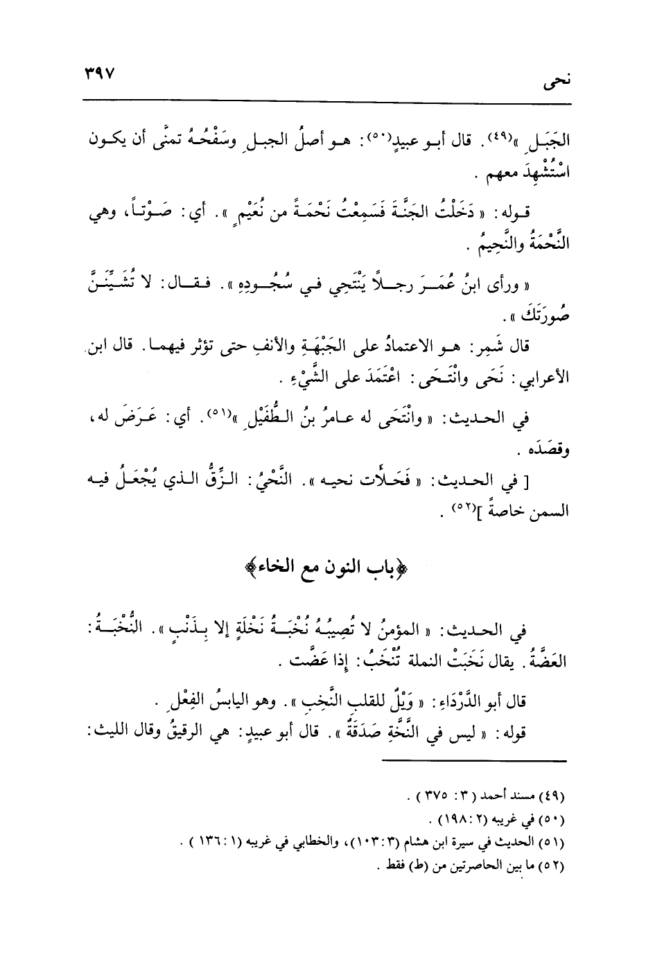 قَالَ شمر هُوَ الِاعْتِمَاد عَلَى الْجَبْهَة وَالْأنف حَتَّى تُؤثر فيهمَا قَالَ ابْن الْأَعرَابِي نحى وانتحى اعْتمد عَلَى الشَّيْء