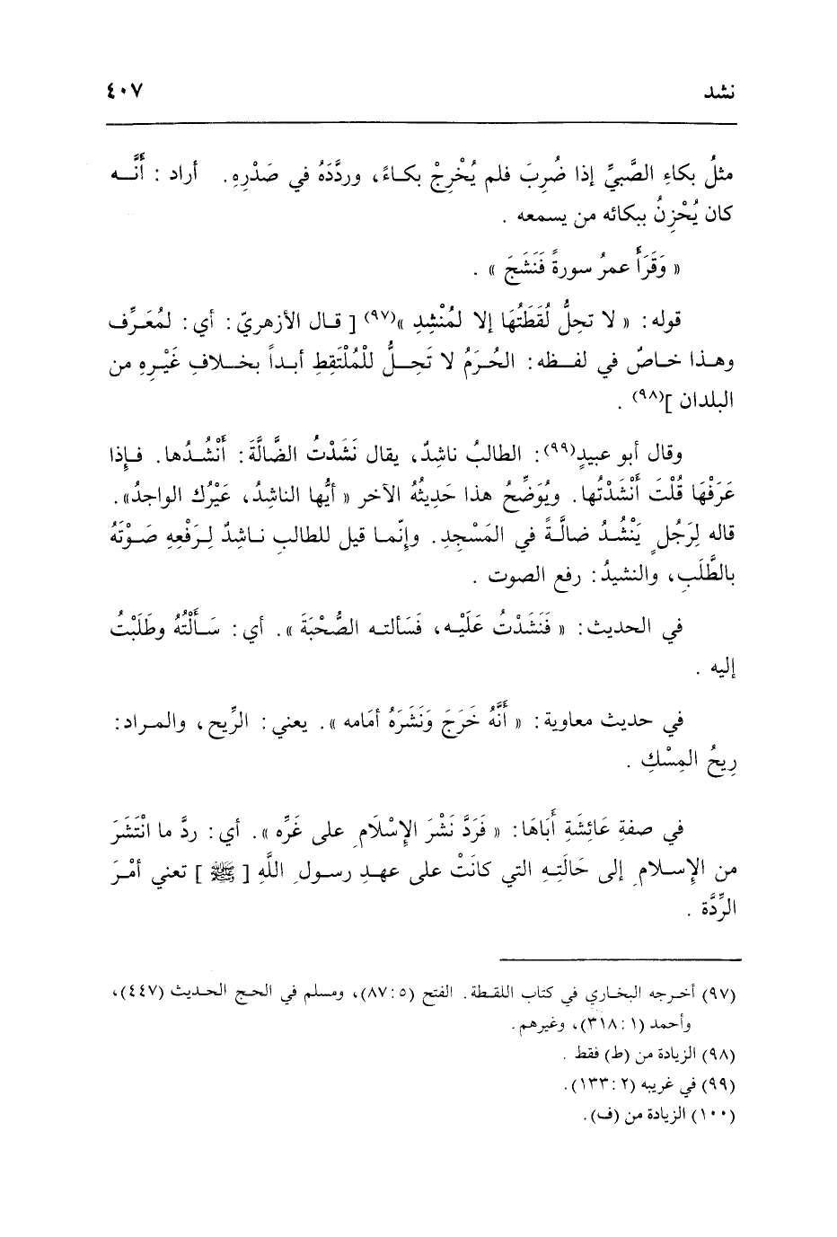 قَالَ أَبُو عبيد الطَّالِب نَاشد يُقَال نشدت الضَّالة أنشدها فَإِذا عرفهَا قلت أنشدتها ويوضح هَذَا حَدِيثه الآخر أَيهَا الناشد عيرك الْوَاجِد قَالَه لرجل ينشد ضَالَّة فِي الْمَسْجِد وَإِنَّمَا قيل للطَّالِب نَاشد لرفعه صَوته بِالطَّلَبِ والنشيد رفع الصَّوْت
