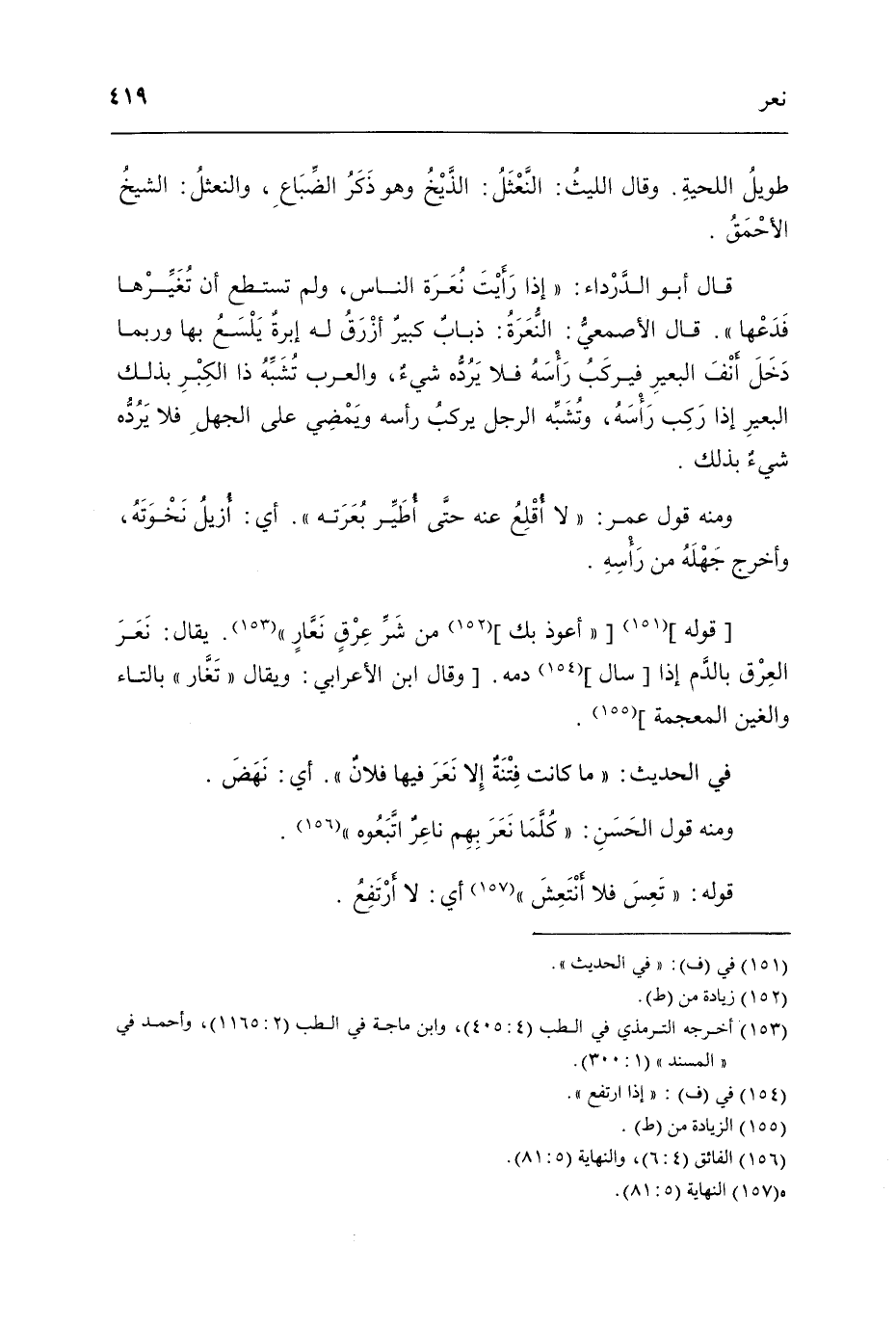 قَالَ أَبُو الدَّرْدَاء إِذا رَأَيْت نعرة النَّاس وَلم تستطع أَن تغيرها فدعها قَالَ الْأَصْمَعِي النعرة ذُبَاب كَبِير أَزْرَق لَهُ إبرة يلسع بهَا وَرُبمَا دخل أنف الْبَعِير فيركب رَأسه فَلَا يردهُ شَيْء وَالْعرب تشبه ذَا الْكبر بذلك الْبَعِير إِذا ركب رَأسه وتشبه الرجل يركب رَأسه ويمضي عَلَى الْجَهْل فَلَا يردهُ شَيْء بذلك