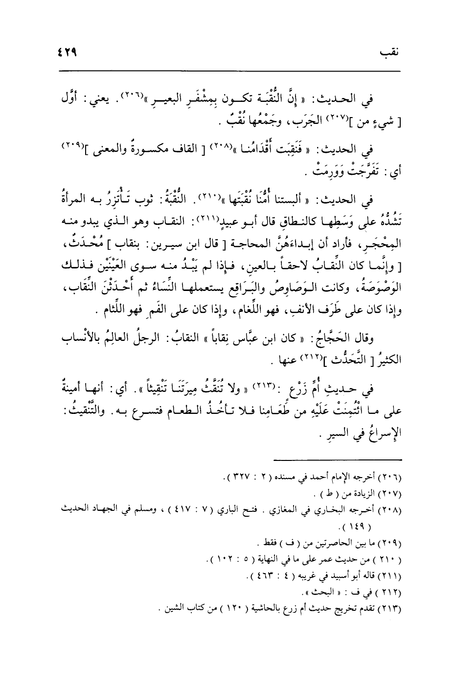 فِي الحَدِيث فنقبت أقدامنا الْقَاف مَكْسُورَة وَالْمعْنَى أَي تفرجت وورمت