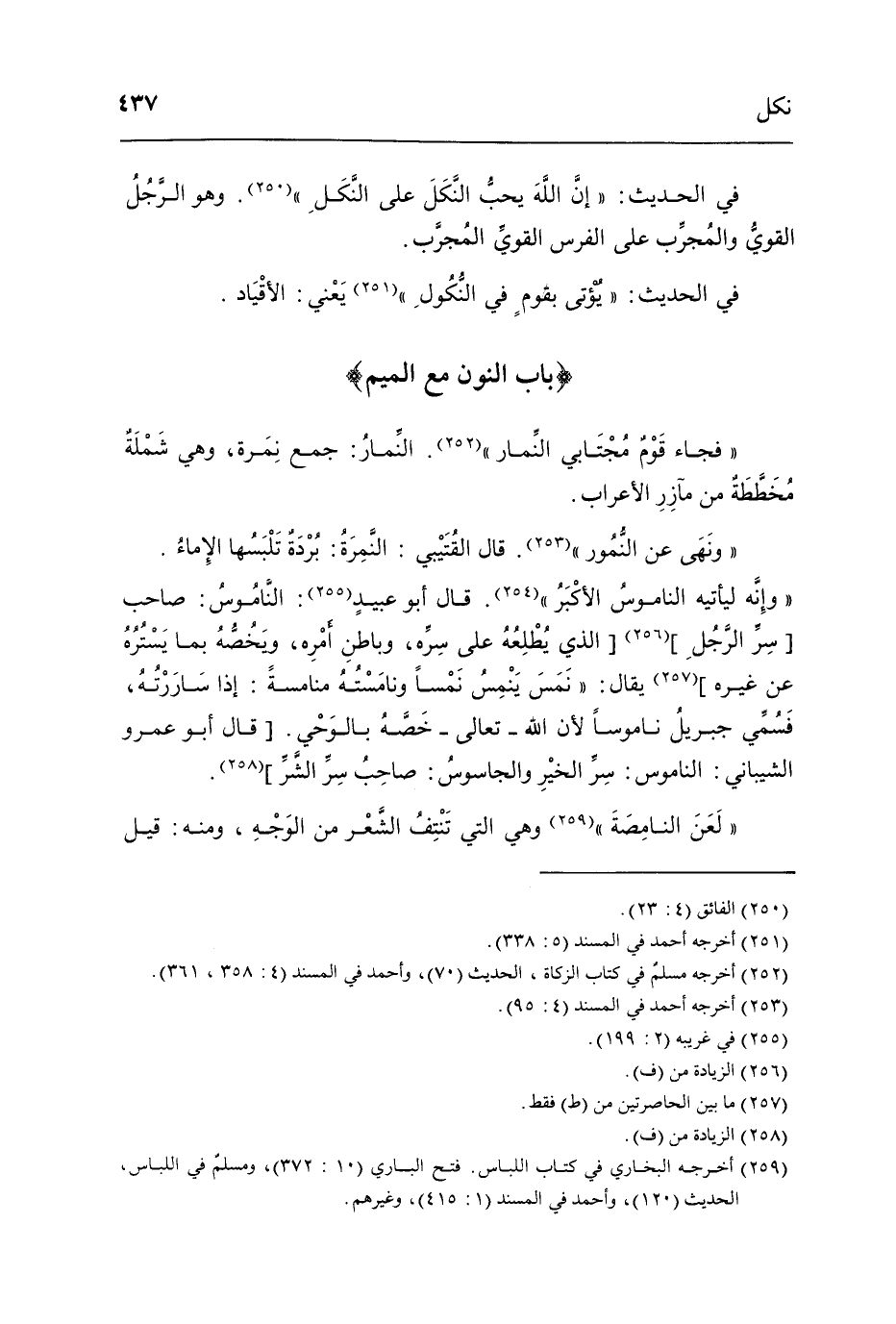 وَنَهَى عَن النمور قَالَ القتيبي النمرة بردة نلبسها الْإِمَاء وَإنَّهُ ليَأْتِيه الناموس الْأَكْبَر قَالَ أَبُو عبيد الناموس صَاحب سر الرجل الَّذِي يطلعه عَلَى سره وباطن أمره ويخصه بِمَا يستره عَن غَيره يُقَال نمس ينمس نمسا ونامسته منامسة إِذا ساررته فَسُمي جِبْرِيل ناموسا لِأَن الله تَعَالَى خصّه بِالْوَحْي قَالَ أَبُو عَمْرو الشَّيْبَانِيّ الناموس سر الْخَيْر والجاسوس صَاحب سر الشَّرّ