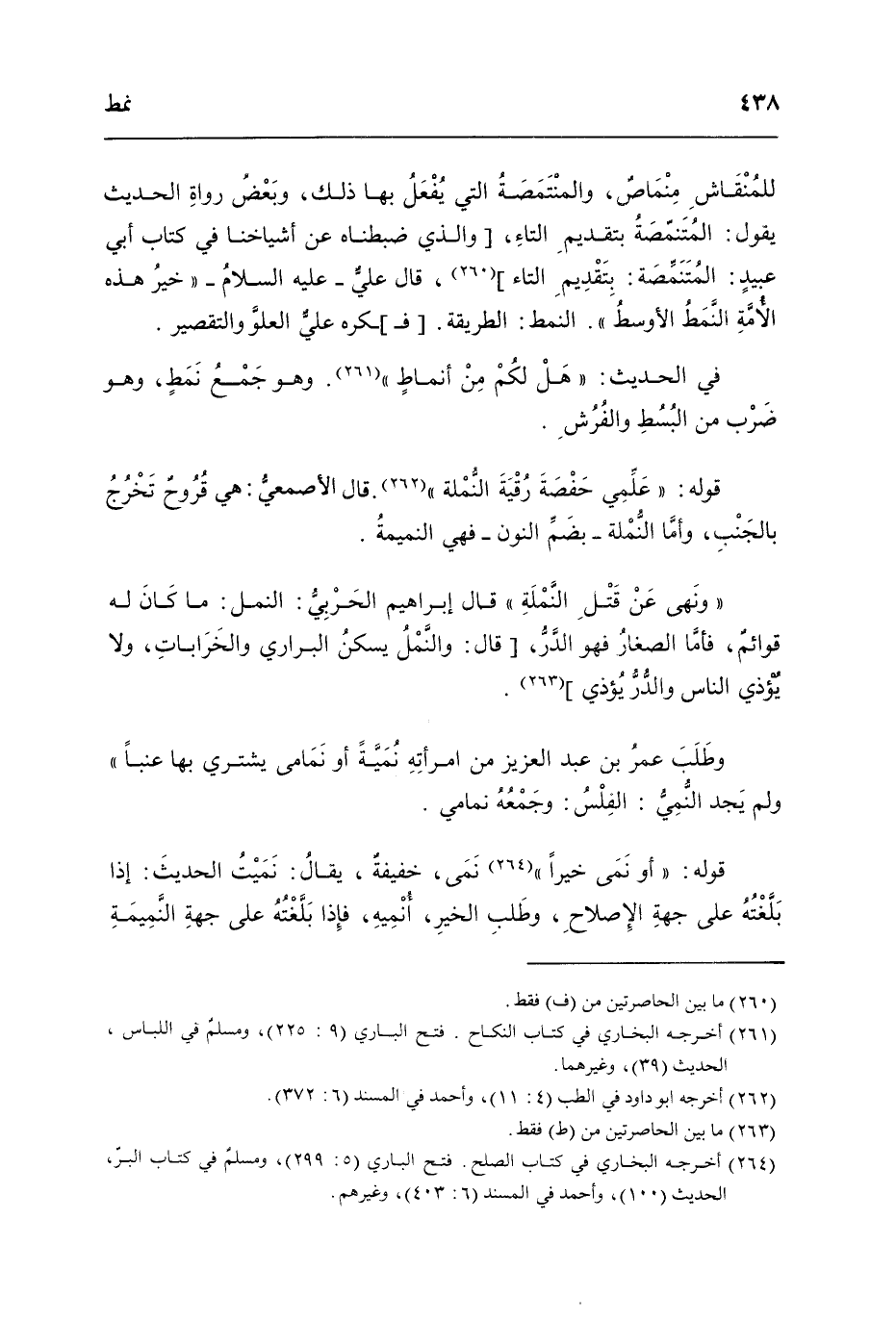 للمنقاش منماص والمنتمصة الَّتِي يفعل بهَا ذَلِك وَبَعض رُوَاة الحَدِيث يَقُول المتنمصة بِتَقْدِيم التَّاء وَالَّذِي ضبطناه عَن أشياخنا فِي كتاب ابي عبيد المتنمصة بِتَقْدِيم التَّاء قَالَ عَلّي عَلَيْهِ السَّلَام خير هَذِه الْأمة النمط الْأَوْسَط النمط الطَّرِيقَة ف كره عَلّي الْعُلُوّ وَالتَّقْصِير